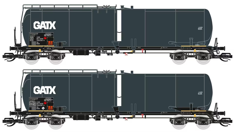 | set dvou tmavě šedých kotlových vozů na lehké oleje „GATX“ |
