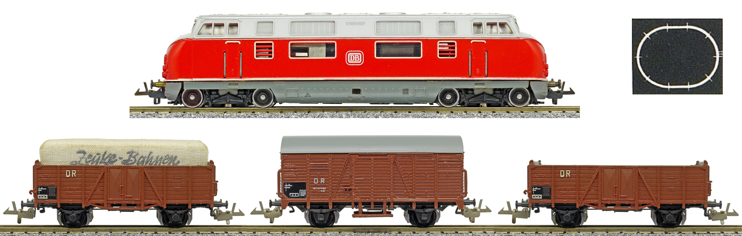 | set dieselové lokomotivy V 200 a tří nákladních vozů |