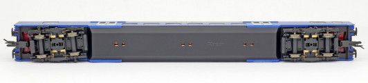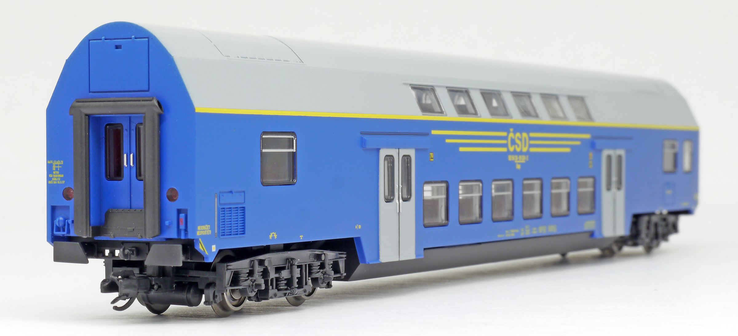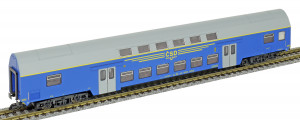| středový patrový vůz v barvě modré, šedá střecha a dveře |