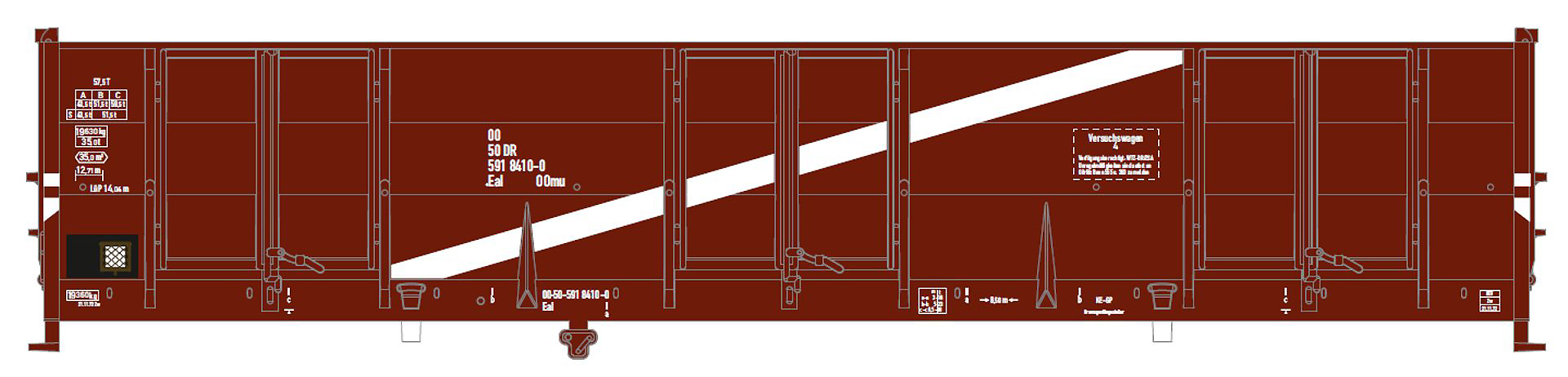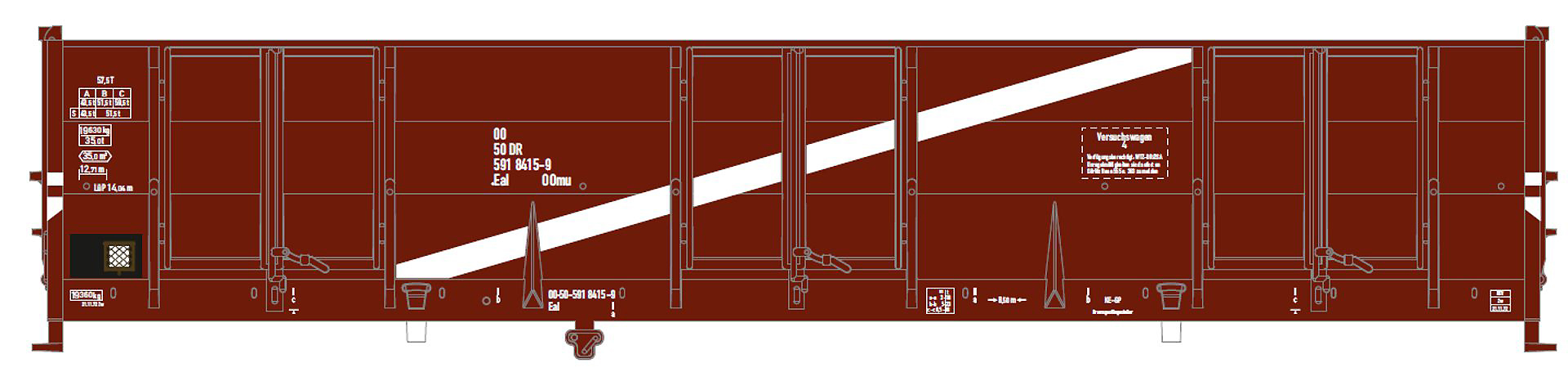 | zkušební nákladní otevřený vůz s bílým pruhem |