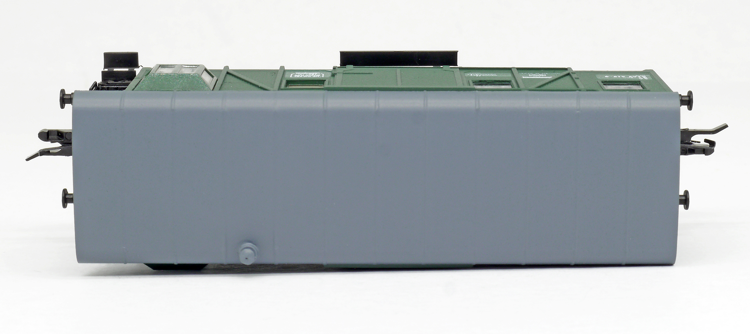 | služební vůz zelený se záplatami, bílé písmo, šedá střecha |