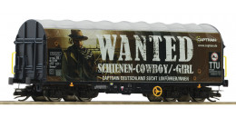 | plošinový nákladní vůz s odsuvnou plachtou s reklamním potiskem „WANTED“ |