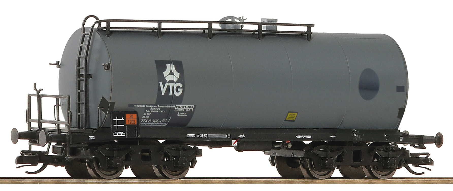 | kotlový vůz šedý s podélnou lávkou a s logem „VTG“ |