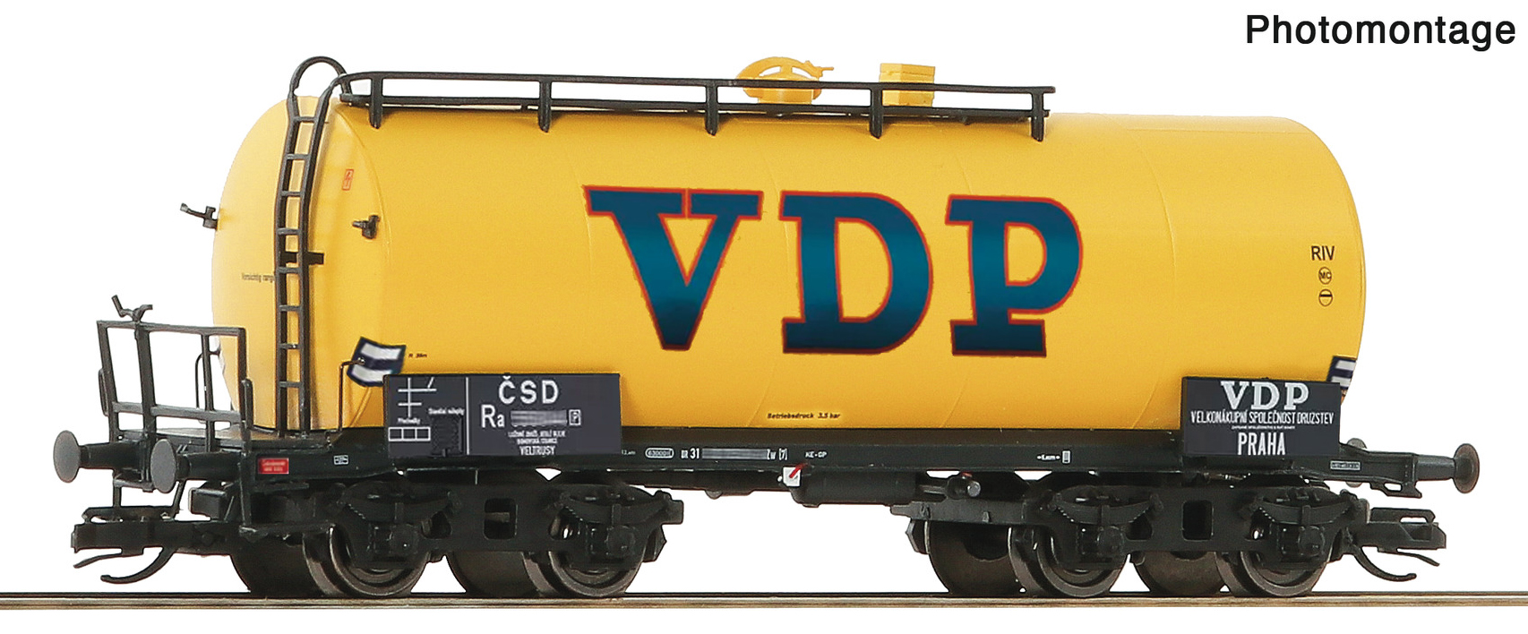 | kotlový vůz žlutý s podélnou lávkou a s logem „VDP“ |