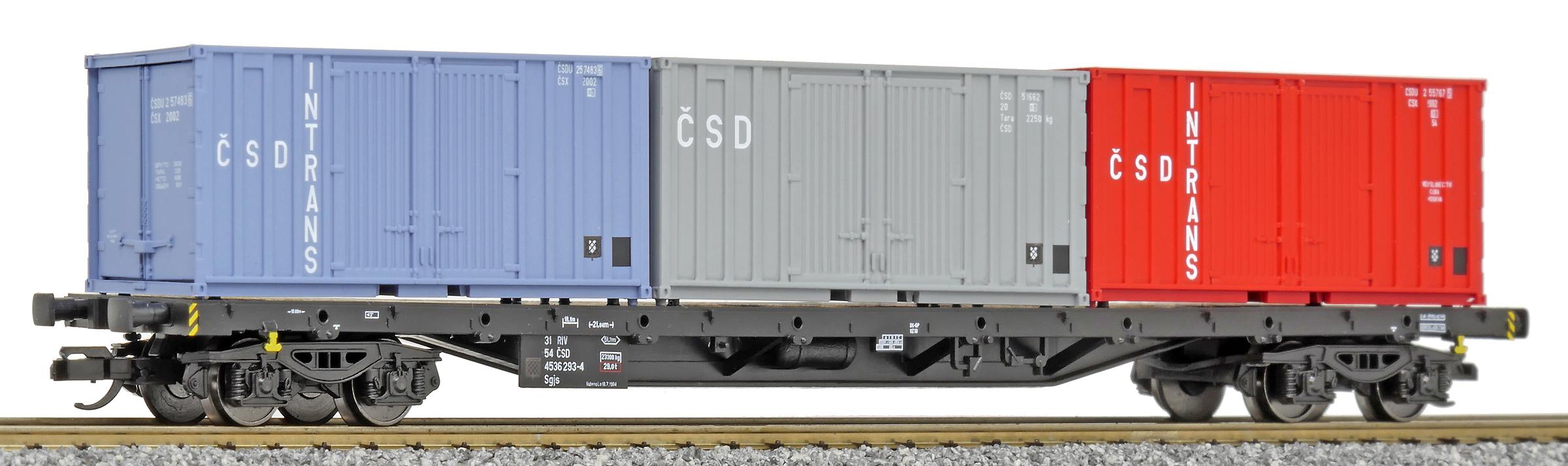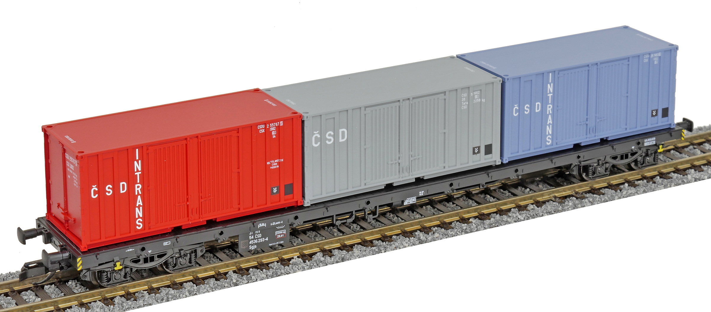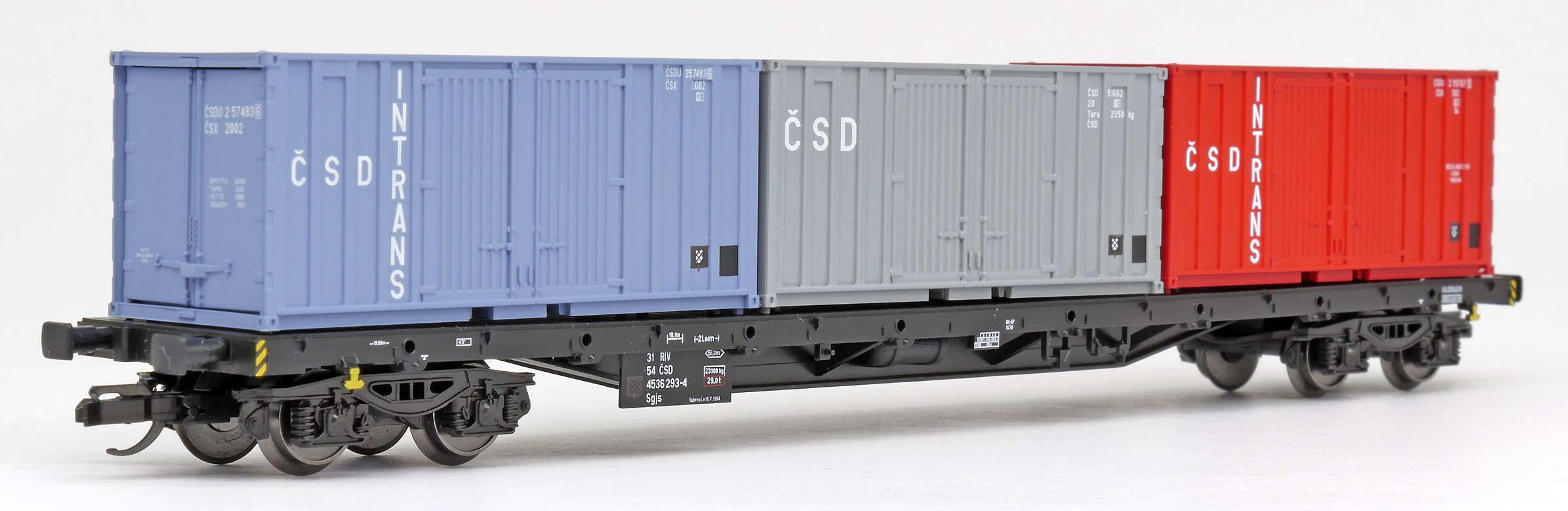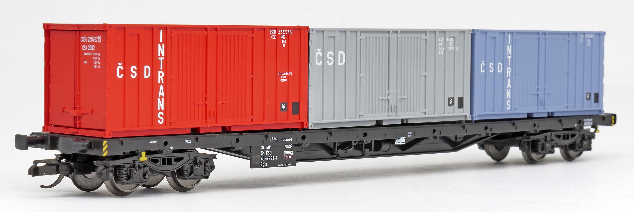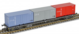 | nákladní plošinový vůz černý se třemi kontejnery 20' „ČSD INTRANS“ |