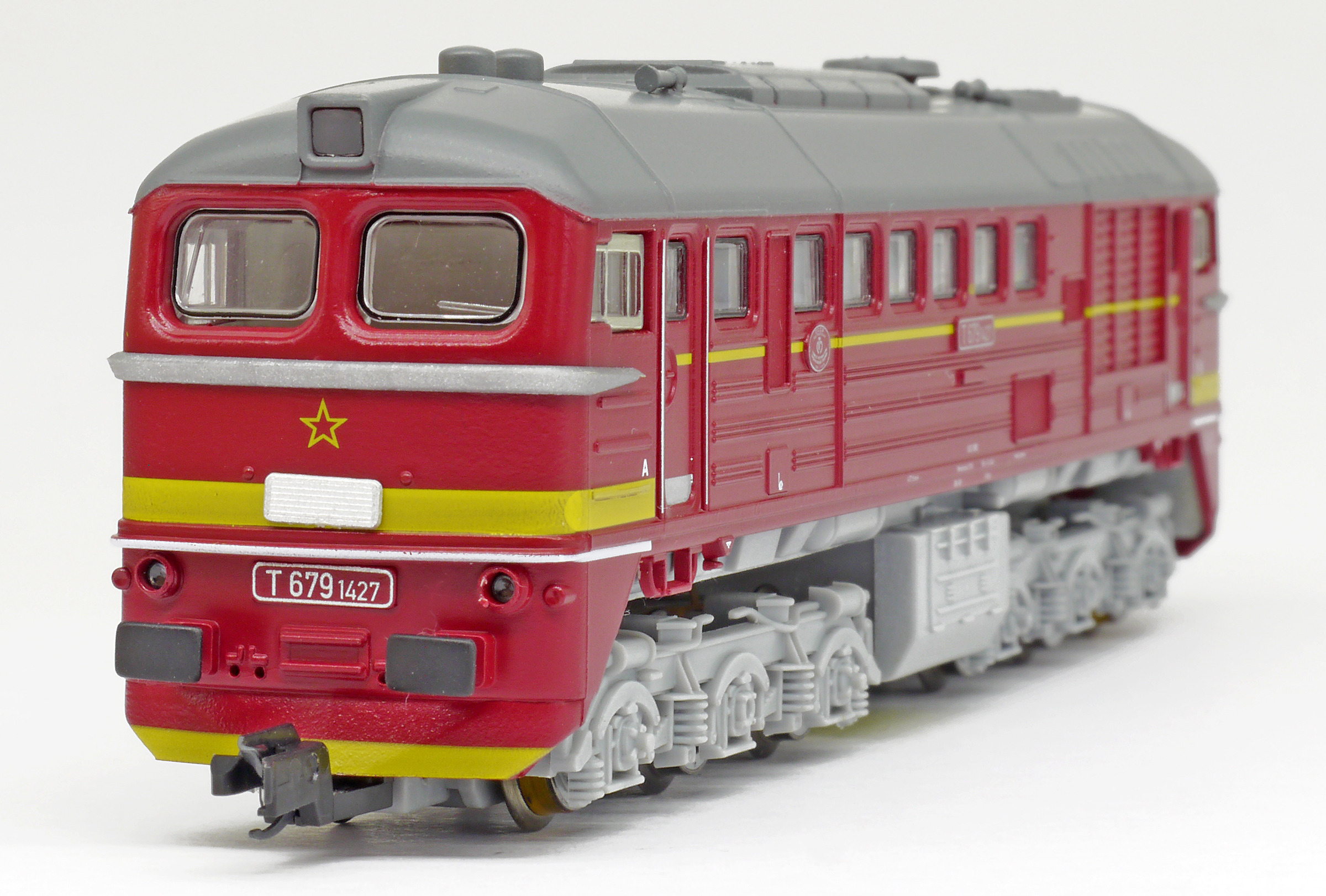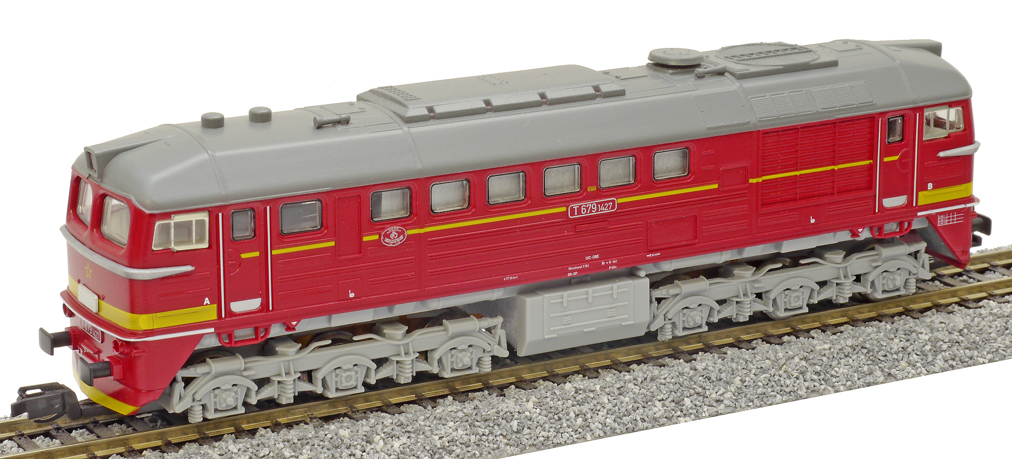 | dieselová lokomotiva červená s šedým pojezdem a výstražným žlutým pruhem |