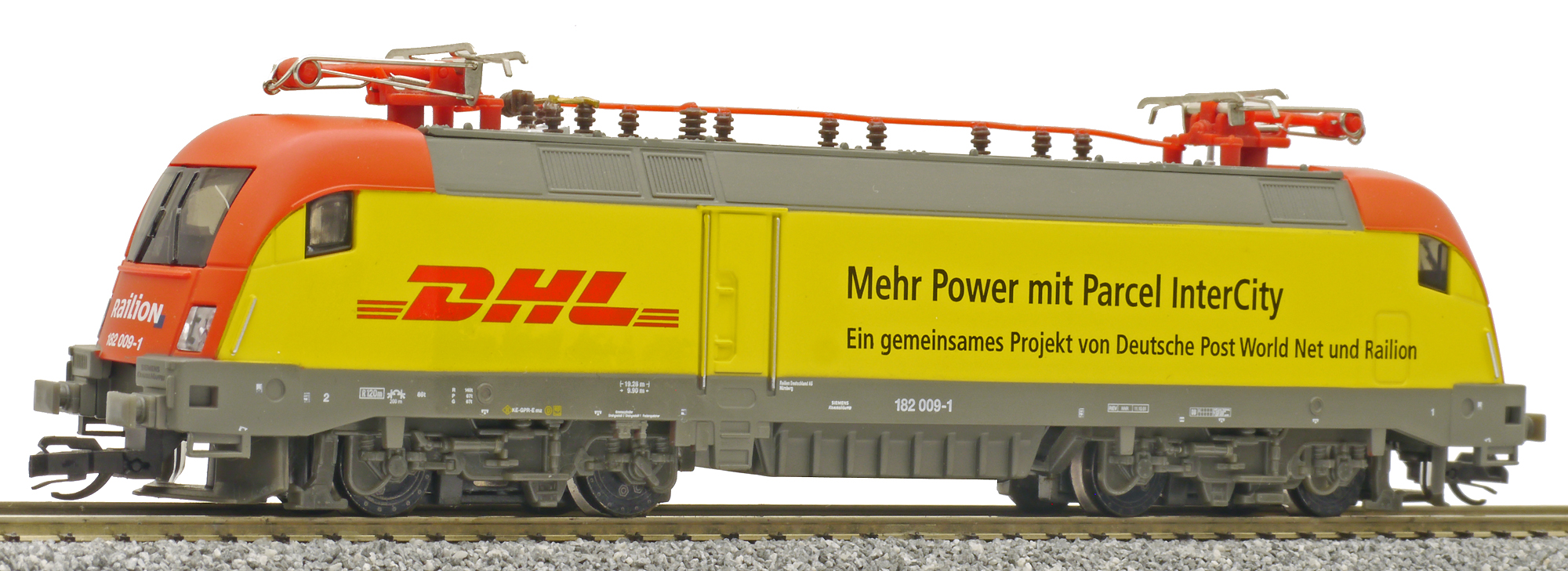 | elektrická lokomotiva žlutá s červenými čely, šedý rám „DHL“ |