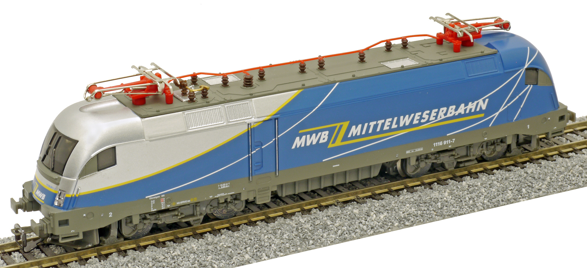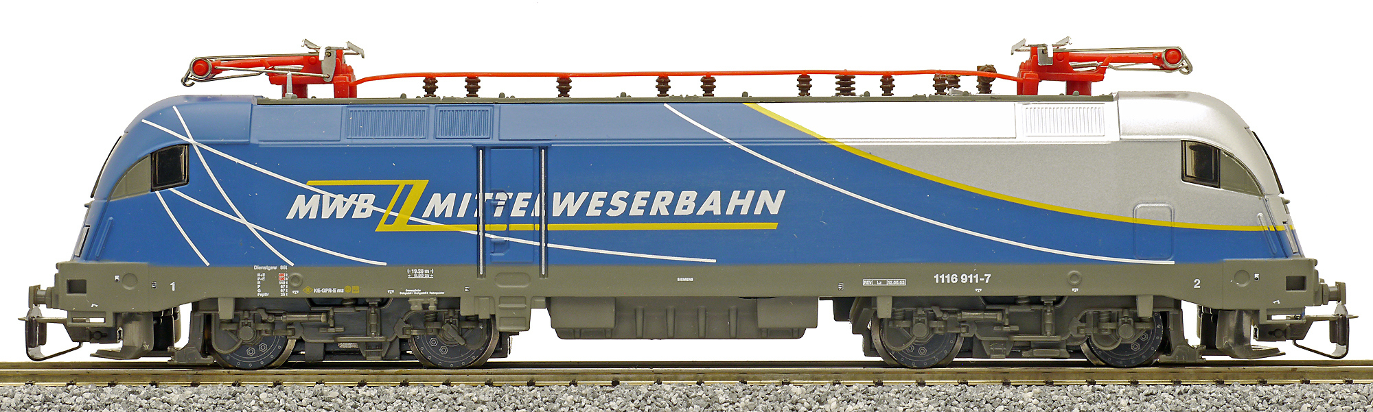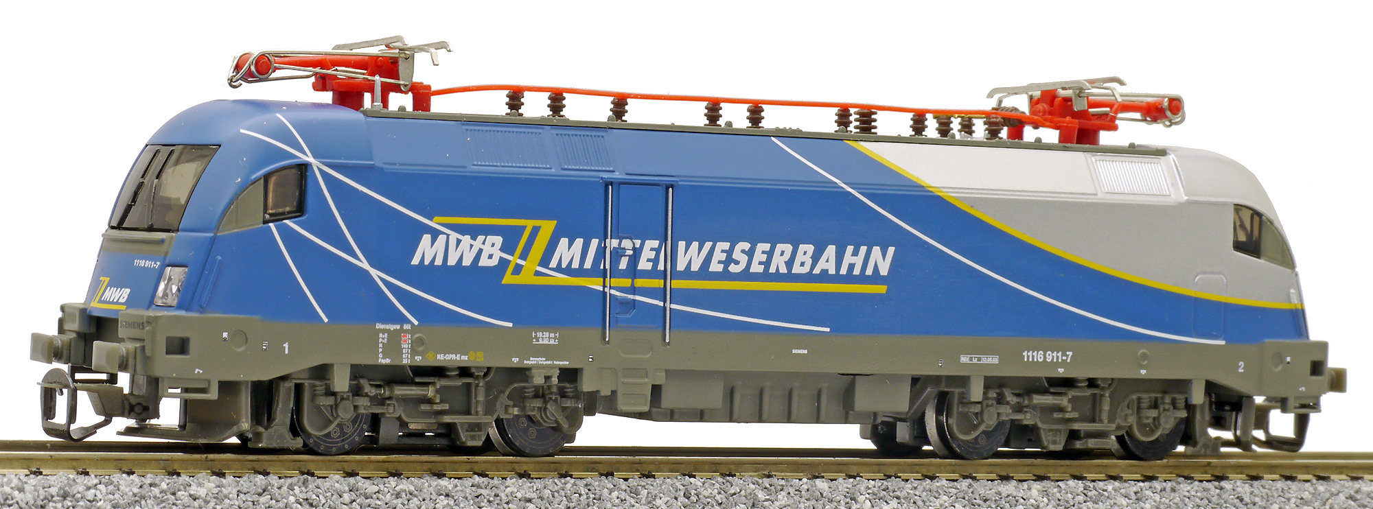 | elektrická lokomotiva modrá-stříbrná s šedým rámem „MWB - Mittelweserbahn“ |