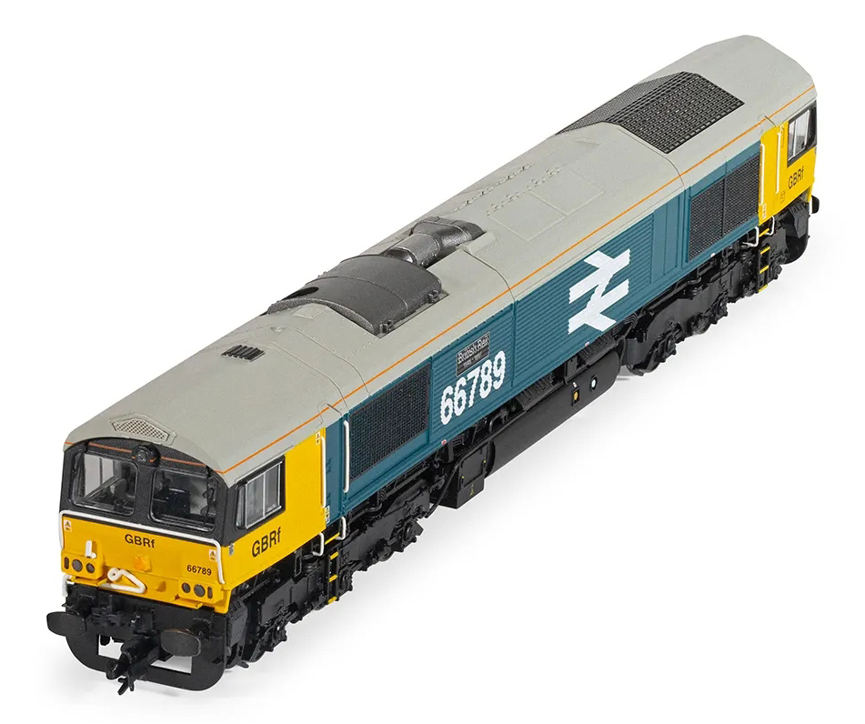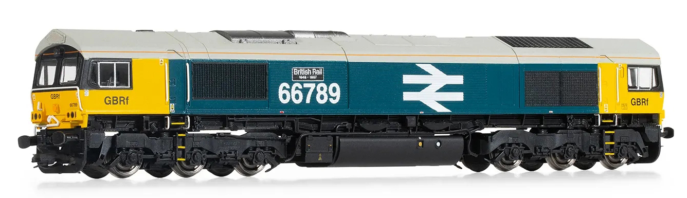 dieselová lokomotiva modrá-žlutá, šedá střecha, černý rám a pojezd „British Rail 1948-1997“