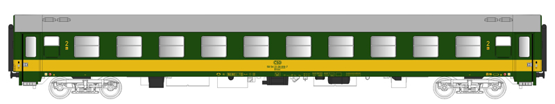 | rychlíkový vůz zelený se žlutým pruhem a šedou střechou 2. tř. |