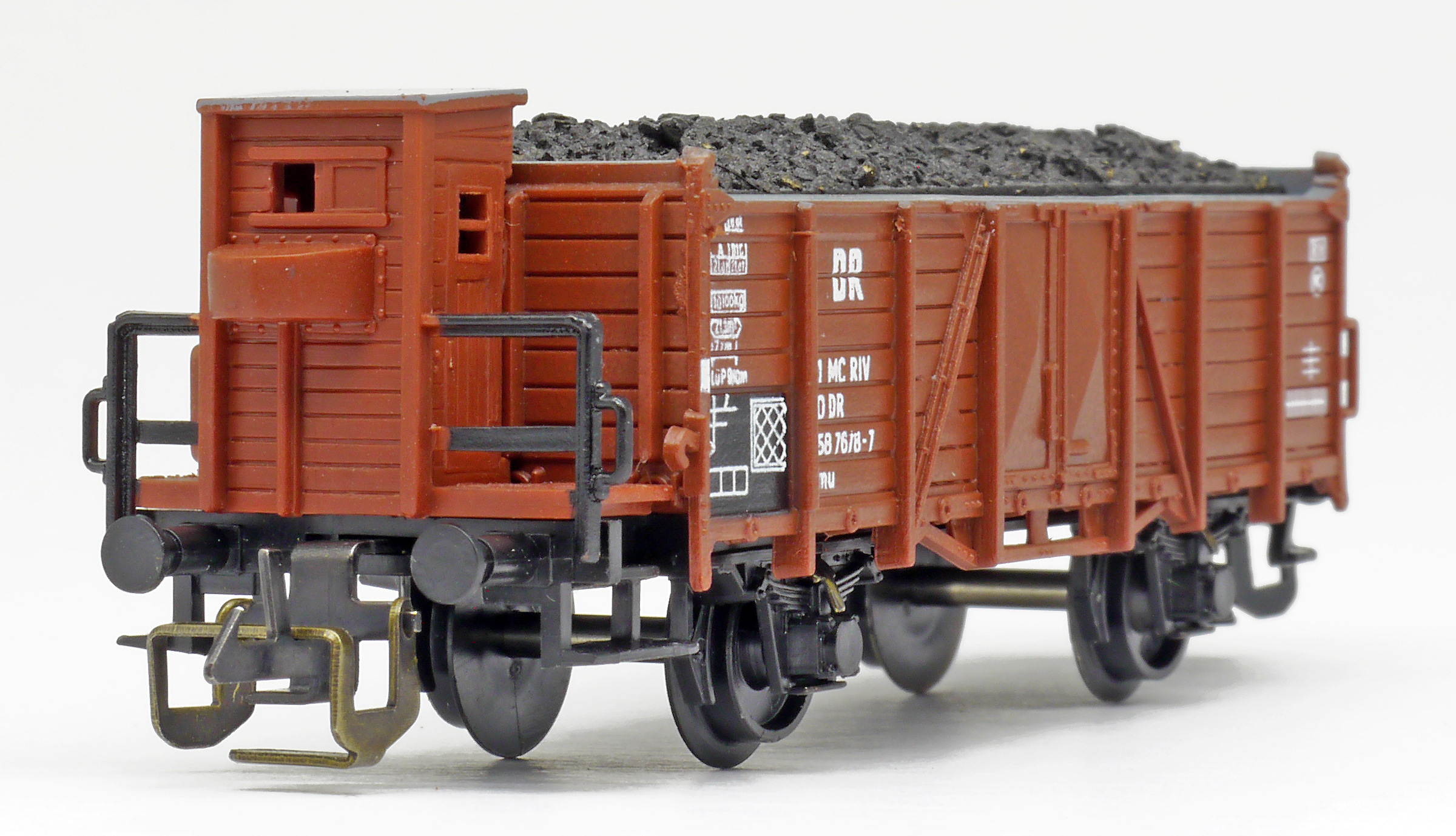 | otevřený nákladní vůz červenohnědý s brzdařskou budkou s nákladem uhlí |