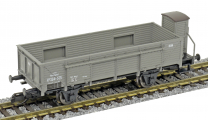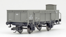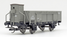 | otevřený nákladní vůz zeleno šedý s brzdařskou budkou |