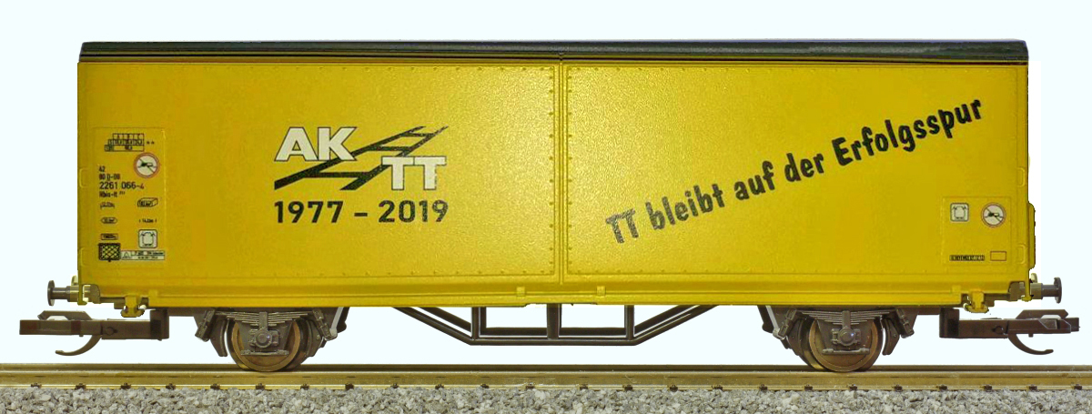 krytý nákladní vůz žlutý s potiskem „AKTT”