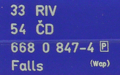 | • 33 54 668 0 847-4 | → | nákladní, s podvozky, pevný rozchod, soukromý vůz, RIV, PPV |