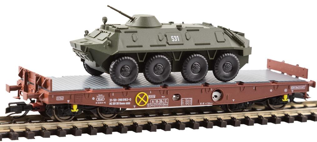 | plošinový vůz červenohnědý s nákladem bojového vozidla SPW60PB |