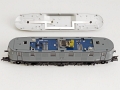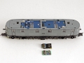 Pohled na sundanou střechu lokomotivy. Dáváme pozor na správnou orientaci střechy. Vlevo od středu střechy je viditelný pružný kontakt, který přivádí napájení od pantografů na kontaktní plošku na hlavním plošném spoji. Uprostřed plošného spoje se nachází dvouřadý konektor PluX12 pro osazení digitálního dekodéru podle normy NEM 658, do kterého je přes redukci zasunuta propojovací destičkou pro analogový provoz.