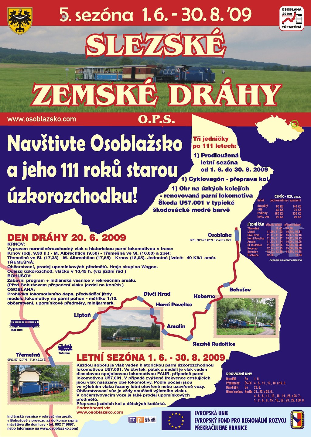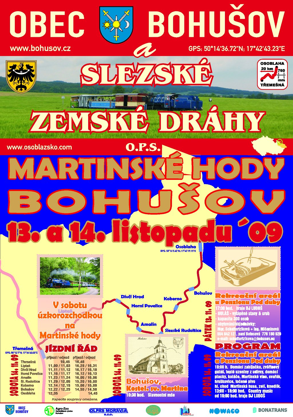 Časně ráno jsem trochu váhal, zda-li se vypravit na cestu. Podzimní deštivé dny mě od výletů spíše odrazují a navíc sobotní ráno bylo zahaleno hutou mlhou. Asi po hodinovém vnitřním přemlouvání jsem vyrazil na cestu. Na Skřítku na chvíli vykouklo slunce z mlhy a za Rýmařovem mlha definitivně ustoupila. Do Třemešné jsem dorazil sice později, než jsem původně plánoval, ale zato s pozitivní náladou. Jízda parního vlaku působí vždy jako magnet. V 9.30 přijela první větší skupina návštěvníků pravidelným Os 3510 z Krnova a následně gumokolisti zaplnili celé přednádražní prostory. Parní vlak byl již připraven v sestavě - parní lokomotiva U57.001, motorová lokomotiva TU38.001, tři vozy Btu a čtyři výletní vozy. Po krátké domluvě s kolegy jsme po desáté hodině vyjeli za Třemešnou k přejezdu úzkorozchodné trati se silnicí č. 57. V podzimním slunci jsme očekávali průjezd pravidelného Os 20606 do Třemešné. Pak stačilo vyhlížet, až se pod lesem objeví R883 Jeseník - Ostrava-Svinov, na jehož příjezd parní vlak čeká. Během několika minut potom stoupající dým nad Třemešnou prozradil, že parní vlak Os 20651 je na trati. Dále za přejezdem vede trať chvíli souběžně s cestou, aby se známým obloukem 75m odpoutala a schovala v lese. Dalším naším zastavením byla stanička Liptaň. Podzimní příroda zbavila stromy listí a odjíždějící parní vlak byl vidět do dáli. Pokračovali jsme nejkratší cestou přes Horní Povelice do míst, kde je z horizontu vidět klikatící se trať mezi zastávkami Horní Povelice - Amalín. Bylo větrno a díky čistému vzduchu jsme parní vlak viděli již na příjezdu do zastávky Horní Povelice. Trať maximálně kopíruje terén a než se parní vlak dostal až na naši úroveň, musel projet několik protisměrných oblouků. Další hezké místo je na horizontu mezi zastávkou Amalín a stanicí Slezské Rudoltice. Sotva parní vlak vysupí na horizont, přechází trať v dlouhé klesání 25 promile až ke Slezským Rudolticím. Tam nás čeká větší pauza. Je nutné doplnit vodu do parní lokomotivy U57.001 a také čekáme na příjezd pravidelného Os 20607, který parní vlak ve Slezských Rudolticích předjíždí. Než může být parní vlak vypraven na trať, je nutné počkat, až pravidelný Os 20607 dojede do Bohušova a strojvedoucí se ohlásí. Trať je volná, parní vlak odjíždí a my za ním. Většina cestujících končí svoji jízdu v Bohušově. V místním rekreačním areálu jsou Martinské hody v plném proudu. Z Bohušova do Osoblahy odjíždí parní vlak téměř prázdný. V Osoblaze je již připraven autobus, který do Bohušova odveze i doprovod parního vlaku. Na místě tak zůstává jen minimum obsluhy a my. Práce kolem parní lokomotivy je stále dost a během pauzy před zpáteční jízdou je potřeba doplnit uhlí a vodu. V 13.50 odjíždí z Osoblahy pravidelný Os 20608 a odváží s sebou navíc jeden vůz Btu z parního vlaku. Ne všichni se budou z Bohušova vracet zpět parním vlakem a tolik vozů na zpáteční jízdě nebude potřeba. Podzimní slunce odpoledne rychle prodlužuje naše stíny a zatím prázdný parní vlak Os 20650 odjíždí v 14.45 do Bohušova, aby nabral cestující zpět do Třemešné. Také jsme opustili Osoblahu a vrátili se zpět do Slezských Rudoltic. Parní vlak vyjíždí z lesa a v 15.20 zajíždí přímo na manipulační kolej. Ve Slezských Rudolticích se opakuje dopolední scénář. Tentokrát čekáme na křižování s pravidelným Os 20609. Oblačnost a mlha na horizontu již schovala slunce, když parní vlak odjíždí v 16.10 ze Slezských Rudoltic. V následujících minutách přichází rychlý soumrak. Než se dočkáme příjezdu parního vlaku v Třemešné ve Slezsku, ponořila se stanice do tmy. Další informační zdroje: