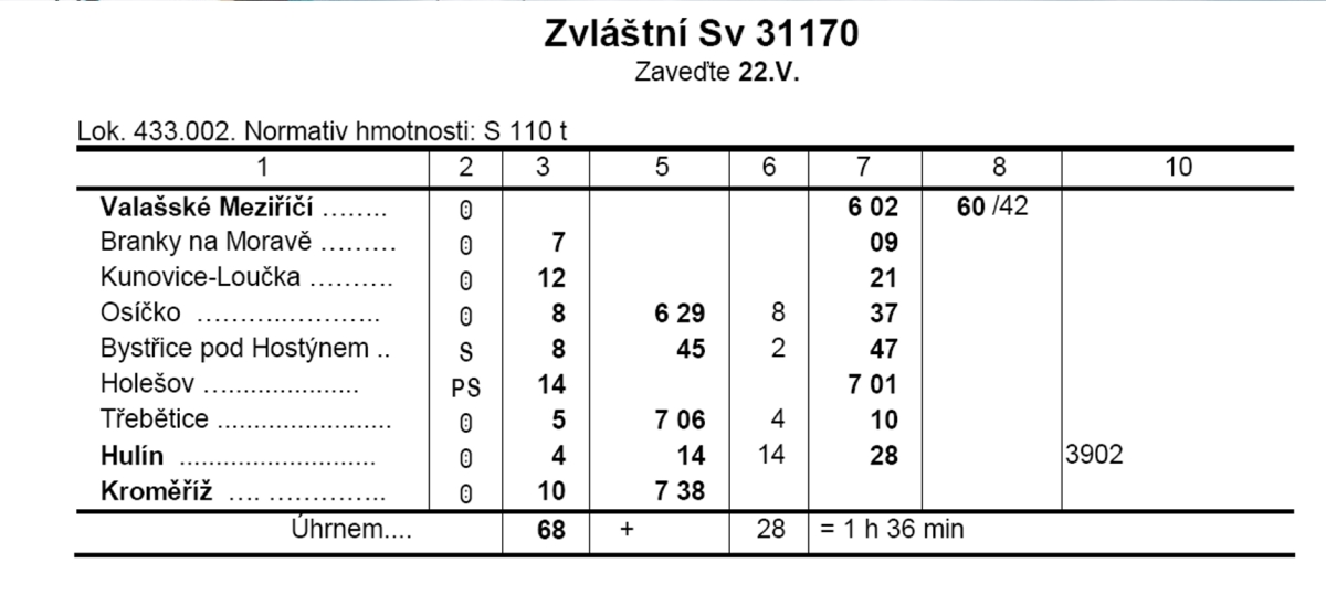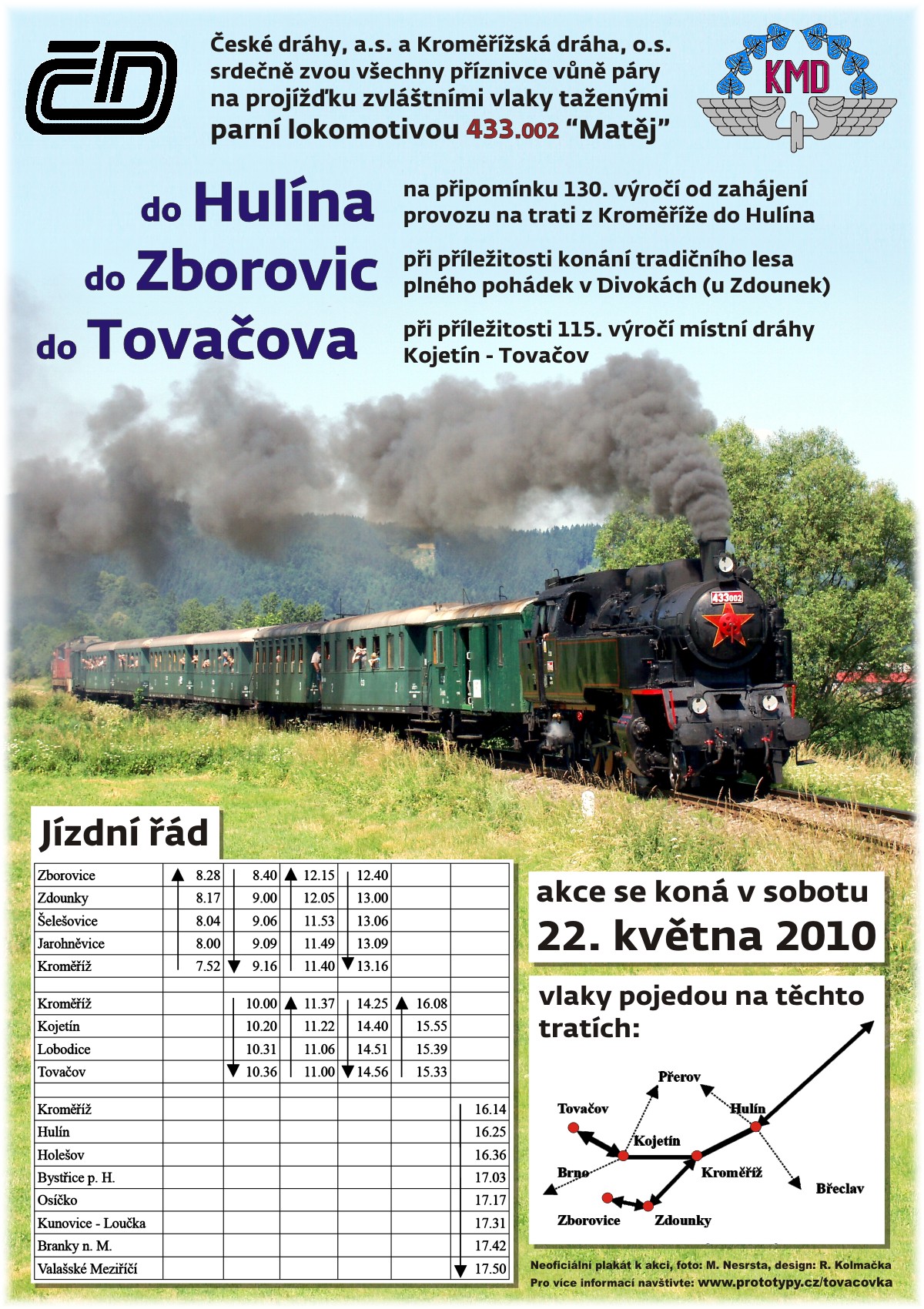 Ranní pohled na mapu z meteorologického radaru nevěstil nic dobrého. Severovýchodní proudění vzduchu stále přinášelo zvýšenou oblačnost a deště, které se zatím držely spíše na severu. V Kroměříži již byla nachystána souprava zvláštního vlaku v sestavě 3 vozů Btx a jednoho Bmx, kterou předchozí den dovezla z Olomouce lokomotiva T466.0007. V sobotu ráno vyjela z Valašského Meziříčí parní lokomotiva 433.002 "Matěj" se služebním vozem Daa-k a bufetovým vozem Ce. Příjezd tohoto Sv jsme očekávali v Kroměříži v 7:38. Během doplnění vody zatím lokomotiva T466.007 sestavila soupravu a první zvláštní vlak se mohl s několikaminutovým zpožděním vydat na první jízdu do Zborovic. Počasí zatím přálo a pouze podmáčená pole připomínala, že by se místo všudypřítomné řepky hodila spíše k pěstování rýže. Ve Zborovicích byl čas jen aby parní lokomotiva 433.002 objela soupravu vlaku a krátce zapózovala fotografům. Na zpáteční jízdě jsme si na parní vlak počkali u polního přejezdu nedaleko bývalé zastávky Skržice. Bohužel pole i polní cesty byly tak rozbahněné, že jsme museli usoudit, že to nebyl dobrý nápad vydat se k trati pro lepší záběr mimo pevnou silnici. Než jsme se odbahnili, počkali jsme na nedalekém přejezdu na průjezd pravidelného Os13908. Další jízda parního vlaku byla v trase Kroměříž (10:00) - Kojetín - Tovačov. Jeli jsme tedy směrem na Kojetín. Jenže počasí už definitnvě otočilo. Během půlhodiny se modrá obloha změnila v šedivou a v Kojetíně nás zastihl déšť. Na příjezd parního vlaku jsme čekali schováni pod přístřeškem skladu. Za Kojetínem jsme si vychutnali jízdu parního vlaku ve stoupání před Uhřičicemi. Jeli jsme dále a rozhodli se zůstat v Lobodicích. U přejezdu jsme vyhlíželi vracející se soupravu zvláštního parního vlaku. Zprava se rychle blížila další bouřka a zleva se od osady Annín přibližoval parní vlak. Záběr jsme stihli a parní vlak uháněl ke Kojetínu. S bouřkou v patách jsme se vydali směrem na Zdounky. Bohužel vytrvalý déšť nás opět držel pod přístřeškem skladiště, odkud jsme vyhlíželi příjezd parního vlaku. S ohledem na déšť jsme do Zborovic nepřejížděli a raději čas využili na rychlé občerstvení ve Zdounkách. Za půlhodinu v 12:47 stále ještě za slábnoucího deště přijel parní vlak ze Zborovic. Ve Zdounkách čekal na křižování s pravidelným Os13909 a my si potom vychutnali rozjezd parního vlaku při jeho odjezdu v 13:00 do Kroměříže. Vrátili jsme se do stanice Kromeříž, kde bylo kupodivu sucho a chvílemi slunečno. Zatímco my jsme osychali, parní lokomotiva 433.002 posunovala k točně, kde za velké pozornosti probíhala provozní údržba a zbrojení vodou. Parní lokomotiva byla také otočena na ruční točně, aby byla otočena komínem k Hulínu, protože se z druhé jízdy do Tovačova vracela celá souprava parního vlaku do Valašského Meziříčí. Nečekali jsme na odjezd parního vlaku a pokračovali jsme opět směrem na Kojetín. Počasí se nechtělo umoudřit a cestou se opět rozpršelo. Při průjezdu Kojetínem kolem rybníku Jordán byla místní komunikace zaplavená bahnem a na místě se již činili hasiči i policie. Opatrně jsme projeli a pokračovali k přejezdům do Uhřičic. Později jsme se dozvědeli, že přívalový déšť zaplavil bahnem z okolních polí i trať přibližně v km 2,3 a druhý pár vlaků do Tovačova byl odřeknut. Souprava zvláštního parního vlaku zůstala v Kojetíně. Vrátili jsme se zpět do Kojetína. Ve stanici se mezitím posunovalo a souprava parního vlaku se chystala na zpáteční jízdu přes Kroměříž a Hulín do Valašského Meziříčí. Místo parního vlaku byl povolán autobus jako NAD v úseku Kojetín - Tovačov. Parní vlak odjel z Kojetína v 15:55 a my si na jeho průjezd počkali na okraji Hulína, kde jsme deštivé sobotní putování ukončili. Další informační zdroje: