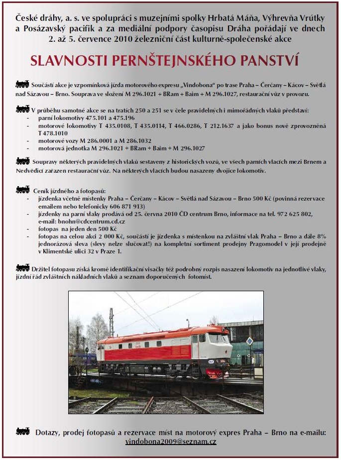 na zvláštním vlaku „Vindobona” z Prahy do Brna. Z motorových lokomotiv potom byly nasazeny „Hektor” T435.0108 a T435.0114 (oba ze sdružení Posázavského