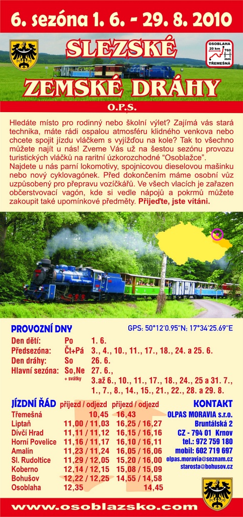 Letní sezóna na trati Třemešná ve Slezsku - Osoblaha   Letošní jízdy výletních parních vlaků na úzkorozchodné trati Třemešná ve Slezsku - Osoblaha obstarává parní lokomotiva U57.001 "Malý Štokr" a dieselová lokomotiva TU38.001 "Faur" podle stejného jízdního řádu jako v minulých letech. Přece jen nějaké změny proběhly. Oba výletní vyhlídkové vozy dostaly nový nátěr. Začátkem prázdnin byly postupně naloženy na plošinový vůz a v krnovském Olpasu dostaly červený kabátek. Další změna se týká složení vozové soupravy výletního vlaku. Na již 9. Dni dráhy Třemešná ve Slezsku - Osoblaha, kterým byla 26.6.2010 zahájena letošní sezóna, byl předveden nový šedý cyklovůz D/ú 843.