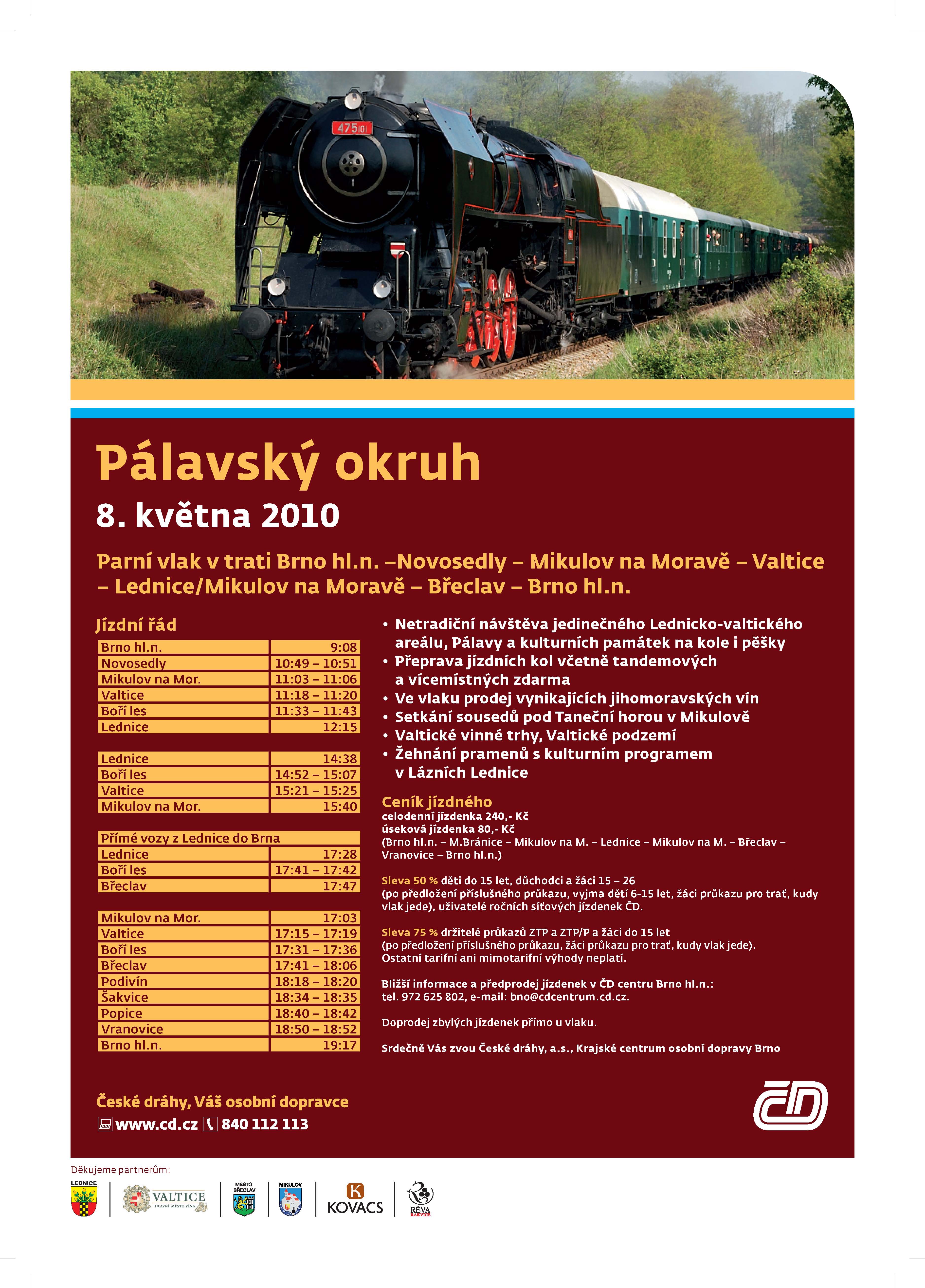 Parní vlak vedený lokomotivou 475.101 vyjíždí z Brna po trati 244 směrem na Střelice a přes Moravské Bránice, Hrušovany nad Jevišovkou, Mikulov na Moravě a Valtice dojede do Bořího lesa nedaleko Břeclavi. Zde se vlak rozdělí a nejdříve dojede do Lednice zadní polovina vlaku Sp 1924 s lokomotivou 478.1001 a ve 12:15 přijíždí parní lokomotiva 475.101 s historickými vozy „Rybáky” jako Sp 1922/3. Odpoledne v 14:38 jede parní vlak Sp 1926/7 z Lednice do Mikulova na Moravě. Ačkoliv je Lednicko-valtický areál propojený silnicí 442 v délce nějakých 6 km, ujede parní vlak vzdálenost přibližně 3x větší. Nejdříve se parní vlak vrátí z Lednice zpět do Bořího lesa. Parní lokomotiva 475.101 objede soupravu a v 15:07 odjíždí parní vlak do Mikulova na Moravě. Pozdě odpoledne se oba vlaky před návratem do Brna sjedou v Břeclavi. První parní vlak vyjíždí z Mikulova na Moravě v 17:03 a do Břeclavi přijíždí v 17:47. Druhý vlak odjíždí z Lednice v 17:28 a do Břeclavi přijíždí v 17:41. Po spojení obou souprav pokračuje parní vlak do Brna s odjezdem z Břeclavi v 18:06. Cestou z Brna do Lednice zastavuje parní vlak poprvé až ve stanici Novosedly. Po trase jsem zvolil první místo v Moravských Bránicích, kde letos dosluhují mechanická návěstidla, a další až v Hrušovanech nad Jevišovkou. Parní vlak s dalšími zastávkami v Mikulově a Valticích pokračoval do stanice Boří les. Dalším oblíbeným místem jsou oblouky nedaleko statku Nový Dvůr poblíž Lednice. Tam jsem čekal na průjezd obou souprav zvláštních vlaků. Během polední přestávky probíhala ve stanici Lednice provozní údržba parní lokomotivy 475.101. Odpoledne se parní vlak vydal na cestu z Lednice do Mikulova přes stanici Boří les. Po silnici je však daleko kratší spojení z Lednice do Valtic silnicí č. 442. Na parní vlak jsem počkal u zastávky Sedlec u Mikulova. Ve stanici Mikulov na Moravě proběhlo další dozbrojení parní lokomotivy vodou. Odpoledne po odjezdu parní vlaku jsem směřoval ke stanici Boří les, kam přijel nejdříve parní vlak z Mikulova na Moravě a za deset minut druhý zvláštní cyklovlak z Lednice. V Břeclavi se obě soupravy spojily a zatímco lokomotiva 478.1001 odjela strojově do Brna, parní lokomotiva 475.101 táhla celou soupravu sama. Poslední mé zastavení bylo ve stanici Vranovice, kde jsem po odjezdu parního vlaku v 18:52 akci ukončil. Další informační zdroje: