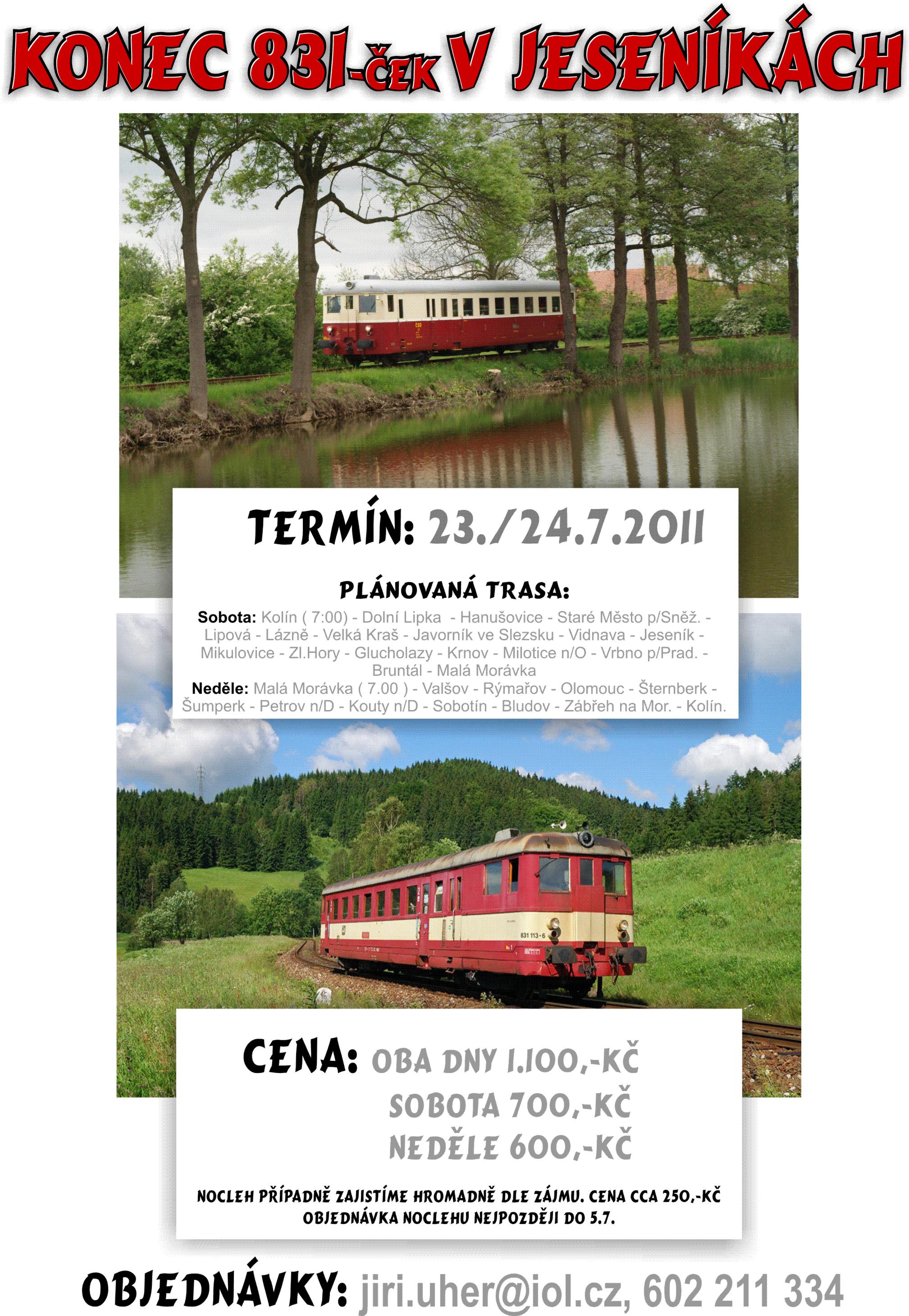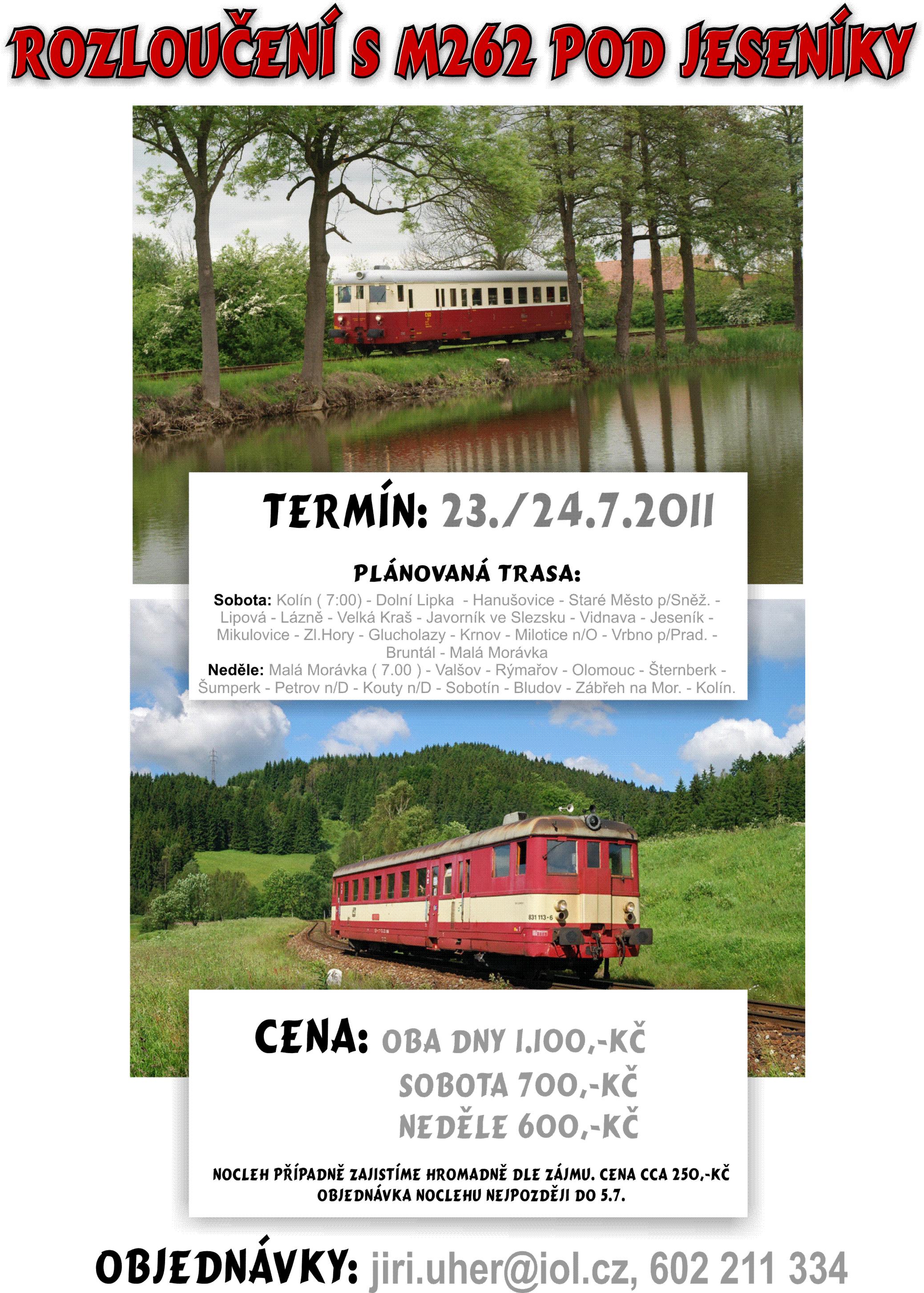 Pro rozloučení s Jeseníky byly připraveny dvě akce. Druhá větší dvoudenní akce zahrnovala okružní projížďku po tratích Jeseníků. Akce se tentokrát zdárně zhostil motorový vůz M262.1002, který vyrazil v sobotu v 7 hodin z Kolína směrem na Jeseníky. Jeho trasa vedla nejdříve přes Ústí nad Orlicí do Dolní Lipky. Využil jsem nabídky a místo jízdy motorovým vozem jsem měl možnost svézt se gumokolem a pořídit pár záběrů. Počasí vypadalo, že by se po přívalových deštích a lokálních záplavách z poloviny týdne mohlo konečně umoudřit. Hned první fotozastávka byla na trati 025 Dolní Lipka - Hanušovice a potom jsme spěchali do údolí říčky Krupá k trati 294 Hanušovice - Staré Město pod Sněžníkem, kterou motorový vůz projel jako zvláštní rychlík R 13650/13651. Dále jsme sledovali motorový vůz na trati 292 z Hanušovic do Lipové Lázní. Tam odbočuje z hlavní trati další lokálková trať 295 Lipová Lázně - Javorník ve Slezsku, kterou projíždí motorový vůz jako R 13614/13617 jen v úseku Lipová Lázně - Velká Kraš a zpět. Přes Vidnavu spěcháme po silnici 347 na hranicích s Polskem dále do Mikulovic, abychom stihli zajet na konec trati 297 Mikulovice - Zlaté Hory, kde bude motorový vůz obracet jako Os 23667/R 23670. Motorový vůz se po příjezdu zpět do Mikulovic spojí se soupravou vlaku Os 3513 a přejíždí peážní tratí přes Głuchołazy na krnovskou část trati 292. Cestou nemůžeme vynechat Brantice s mechanickými návěstidly a dále nás už čeká lokálková trať 313 Milotice nad Opavou - Vrbno pod Pradědem, kterou motorový vůz projíždí po 17. hodině jako Sv 13520/13519. A už před námi toho dne zbývá poslední trať 312 Bruntál - Malá Morávka. Motorový vůz M262.1002 přijel jako R 76267 do Malé Morávky, kde ho i nás čekalo přenocování. Nedělní jízdy pokračovaly ve stejném stylu, ale tentokrát jsem jel s ostatními účastníky akce ve vlaku. Z Malé Morávky jsme odjeli s předstihem jako R 76277 do Bruntálu. Ráno nás ještě doprovázelo slunce, ale během dopoledne se nasunula od západu oblačnost, která se už bohužel udržela po zbytek dne. Popojeli jsme po trati 310 z Bruntálu do Valšova, abychom mohli jako R 23502/23503 projet další lokálku 311 Valšov - Rýmařov. Po návratu zpět do Valšova nás čekal přejezd nejdříve po trati 310 do Olomouce a potom po trati 290 do Šumperka. Zbývalo nám projet trať Železnice Desná 293 Šumperk - Kouty nad Desnou s odbočkou do Sobotína. Jako Os 79236 jsme jeli v úseku Šumperk - Kouty na Desnou. Tam následovala polední pauza na oběd a zároveň jsem zde ukočil jízdu ve vlaku a přesedl zpět za gumokol, abych mohl pořídit pár záběrů z jízdy Os 79237 Kouty nad Desnou - Šumperk a také z odbočky Petrov na Desnou - Sobotín, kam motorový vůz zajel jako Os 23878/23879. V Petrově nad Desnou jsem zakončil dvoudenní putování po lokálkách Jeseníků. Motorový vůz M262.1002 spěchal do Šumperka a dále po trati 291 do Zábřeha na Moravě. Odtud už zbývalo zdolat poslední úsek po trati 270/010 do Kolína s plánovaným příjezdem v 17:19. Další informační zdroje: