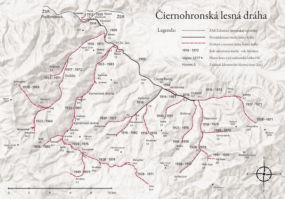 Doprava dřeva z Horehroní byla po několik století doménou vodních toků. Stávající bystřiny v okolních údolích nebyly pro splavování dřeva moc vhodné. Bylo nutné koryta upravovat a budovat vodní nádrže k zajištění dostatku vody pro splavení vytěženého dřeva, kulatiny, spíše kratších polen. Úzkorozchodná železnice s rozchodem 750 mm si vydobyla svoje místo již v roce 1878 při dopravním spojení mezi železárnami v Podbrezové a slévárnou v Hronci. Původní plány lesní železnice počítaly s vybudováním spojení mezi pilami v Čiernom Balogu a Hronci a s napojením na normálněrozchodnou železnici v Podbrezové. První část trati z Čierneho Baloga do Hronca byla dána do provozu v roce 1909 a železnice měla maďarský název Feketegaramvölgyi Vasút (F.G.V.), přeloženo jako „Dráha v údolí Čierného Hronu“. Následná dostavba trati z Hronca do Podbrezové si vyžádala změnu v projektu. Kvůli rozvoji hutí v Podbrezové došlo mezitím k posunutí železniční stanice a napojení lesní železnice kvůli stísněným podmínkám muselo být provedeno jinak. V roce 1910 byla z Chatimechu vybudována normálněrozchodná vlečka do Hronca vedená paralelně se zmiňovanou hutní úzkorozchodnou tratí a v Hronci bylo vybudováno překladiště mezi lesní železnicí a normálněrozchodnou vlečkou. Další rozšiřování sítě lesní železnice nebylo přerušeno ani během 1. světové války, kdy byli na zemních pracích nasazeni především váleční zajatci. V nově vniklé Československé republice byla lesní železnice přejmenována na Čiernohronskou lesní dráhu (Č.H.L.D.) a neustávalo ani budování dalších odboček do okolních údolí. Délka všech tratí lesní železnice dosáhla úctihodných 132 km. V letech 1927 - 1962 byla v úseku Čierny Balog - Hronec zavedena osobní doprava. Bohužel ani tato lesní dráha nemohla odolávat dostupné a operativní automobilové dopravě. Postupně v 60. letech začalo docházet k omezování provozu, redukci železniční sítě a 31. prosince 1982 byl provoz ukončen na zbývajících 36 km trati. Z nařízení vlády SSR měla být lesní železnice do konce roku 1985 kompletně zlikvidována. Ještě v roce 1982 se díky nadšencům podařilo lesní železnici zapsat na seznam státních kulturních památek. V roce 1983 vznikl ve Vydrovské dolině bezplatný pracovní tábor „Strom života“, jehož brigádníci pomáhají při obnově železničky. Slavnostní zahájení obnoveného provozu na lesní železnici, výletních vlaků pro veřejnost, bylo 1. května 1992. Centrum Čiernohronské železnice je v Čiernom Balogu, odkud jsou vypravovány výletní vlaky pro veřejnost. Pro letošní rok 2013 jsou v nabídce tyto vlaky: