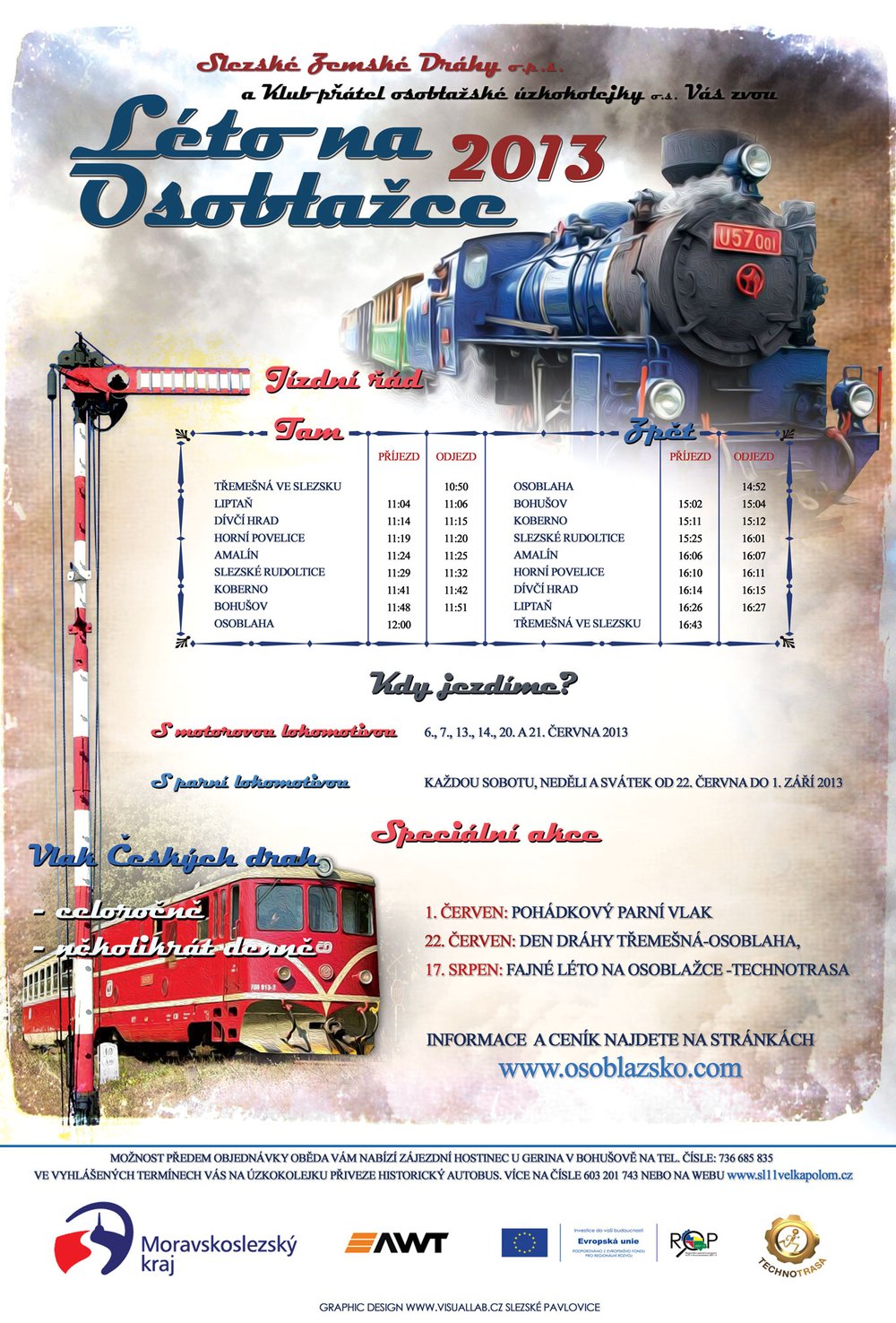 Jízdní řád výletních vlaků Os20651/20650 je přibližně stejný, jako byl v uplynulém roce. Časové polohy vlaků se změnily jen o několik minut. V Třemešné ve Slezsku čeká parní vlak Os20651 na příjezd Os20606 z Osoblahy (10:40) a na přípojný Sp1663 z Jeseníku (10:41). O prázdninách jsou všechny výletní vlaky vedeny parní lokomotivou U57.001 „Malý štokr”. Od „Dne dráhy” do konce prázdnin tak parní lokomotiva odvozí za 24 dní celkem 48 vlaků. Navíc v červnu před zahájením hlavní turistické sezóny byly připraveny jízdy zvláštních vlaků s dieselovou lokomotivou TU38.001 „Faur”. Jízdy naplánované na čtvrtky a pátky byly určené hlavně pro školní výlety. Prázdninové jízdy zvláštních parních vlaků na Osoblažsku jsou vyhledávanou atrakcí. Už hodinu před odjezdem parního vlaku Os20651 bývá parkoviště u nádražní budovy zaplněné a zaplňovat se začínají i další odstavné plochy kolem příjezdové cesty k nádraží. Kdo plánuje dopředu výlet na Osoblažsko, může si případně místo ve vlaku rezervovat na webových stránkách dopravce. Kapacita vlaku je tři výletní vozy a může být podle rezervací rozšířena ještě o jeden vůz typu Balm/ú. Jeden z výletních vozů je upraven a umožňuje přepravu imobilních cestujících. Uprostřed vlaku je zařazen „pivní vagón”, který by měl spíše nést označení bufetový. Kromě základního občerstvení lze v něm zakoupit i drobné upomínkové předměty. Pivaři by mohli být zklamáni, že pivo je k dispozici pouze v plechovkách v lednici. Především kodrcající vagónek by pivní sudy natřásal a čepování takového piva by bylo problematické. Dále cyklisty jistě potěší nový cyklovagón, který je od roku 2010 zařazován do soupravy vlaku. A ve výčtu vozů soupravy nesmí chybět servisní generátorový vůz, který poskytuje zázemí vlakové a lokomotivní četě a který veze generátor pro osvětlení vlaku a jako zdroj energie pro pivní vagón. Téměř tříhodinový pobyt parního vlaku v Osoblaze lze využít k občerstvení buď u nedalekého koupaliště, které je přes prázdniny v provozu, nebo na osoblažském náměstí. Cestující mohou také vystoupit v Bohušově a dojít do rekreačního areálu, kde je možností pro využití volného času více. Pravidelnou dopravu na trati zajišťuje rekonstruovaná lokomotiva 705 913-2 s jedním rekonstruovaným vozem Balm/ú. Tato souprava bývá o víkendech doplněna ještě o jeden vůz na spojích Os20608/20609. Část cestujících, zvláště pak s malými dětmi, využije k návratu do Třemešné ve Slezsku právě pravidelný vlak Os20608, které odjíždí z Osoblahy v 13:53, tedy o hodinu dříve, než se vrací parní vlak Os20650. Ten má při zpáteční jízdě navíc prodloužený pobyt ve Slezských Rudolticích (15:25 - 16:01) kvůli křižování s Os20609 v 15:53. Z celého dne se tak ve videoreportu záběry z jízdy parního vlaku doplněny o několik záběrů pravidelných spojů. Odpolední jízdu parního vlaku Os20650 si můžeme ještě vychutnat několika záběry přímo z budky parní lokomotivy U57.001. Krátký sestřih z jízdy v úseku Horní Povelice - Dívčí Hrad - Liptaň přiblíží náročnou práci lokomotivní čety, která je skryta pohledu běžného cestujícího. Právě při zpáteční jízdě, kdy trať z Osoblahy do Třemešné ve Slezsku převážně stoupá a je nutné doplnit při pobytu ve Slezských Rudolticích vodu, se topič na parní lokomotivě pěkně zapotí. Po příjezdu parního vlaku do Třemešné den ještě zdaleka nekončí. Okolí nádraží se vyprázdní, avšak vzadu na kolejích panuje čilý ruch při rozposunování soupravy. Reportáž je zakončena několika záběry na jízdu podvečerního vlaku Os20610 z Osoblahy do Třemešné ve Slezsku. Další informační zdroje: