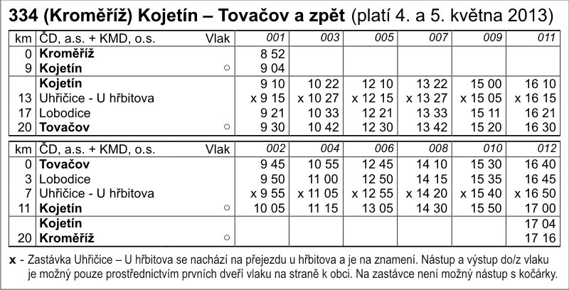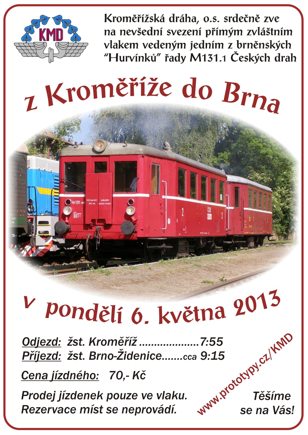 Po celý víkend jezdily mezi Kojetínem a Tovačovem zvláštní vlaky sestavené z motorového vozu M131.1463 „Hurvínek” a přípojného vozu BDlm. Kromě zastávky Lobodice (nákladiště) byla na trati ještě jedna provizorní zastávka Uhřičice - U hřbitova na okraji Uhřičic na přejezdu s místní komunikací vedoucí ke hřbitovu. Na této zastávce na znamení byl možný nástup/výstup pouze prvním dveřmi vlaku na straně k obci. První vlak 001 (Os 31016) vyjížděl z Kroměříže a poslední vlak 012 (Os 31027) se do Kroměříže zase vracel. V Kroměříži také nocovala souprava vlaku až do pondělí, kdy se vracela jako zvláštní vlak ráno zpět do Brna. Na Tovačovce jsem se zúčastnil pouze sobotních jízd a jako obvykle jsem očekával počasí typické pro akce v tomto regionu. Snad přítomnost velkých vodních ploch mění proudění větrů a tak se stalo již pravidlem, že ačkoliv jinde panuje slunečné počasí, tak zde v okolí Tovačova je přinejmenším polojasno a větrno. Na podzimních akcích zde bývají pravidelně mlhy, které vydrží klidně celé dopoledne. Ani tentokrát tomu nebylo jinak. Snažil jsem se postupně navštívit klasická místa podél trati a neopomněl jsem se zastavit ani v Kojetíně a Tovačově na zdokumentování posunování motorového vozu M131.1463 „Hurvínek”. Navíc v Tovačově proběhlo mezi vlaky 007 (Os 31022) a 008 (Os 31023) společné fotografování s Hurvínkem. Nebylo možné si nevšimnout, že na pořádek v Tovačově dohlížela posílená vojenská hlídka. Jízdy zvláštních vlaků byly doprovázeny průvodčími v dobových uniformách a ve vlaku bylo možné zakoupit předměty s železniční tematikou. Kromě jízdenek na různé tarifní vzdálenosti bylo možné podpořit provoz vlaků na trati Kojetín - Tovačov zakoupením některé ze dvou příspěvkových jízdenek. Jízdy zvláštních vlaků na trati Kojetín - Tovačov při příležitosti kulturních akcí v okolí se již stalo tradicí. Tradiční je také snaha sdružení Kroměřížská dráha zajistit pro vozbu zvláštních vlaků pokaždé jiné soupravy a lokomotivy a udržet tak atraktivitu těchto akcí. Další informační zdroje: