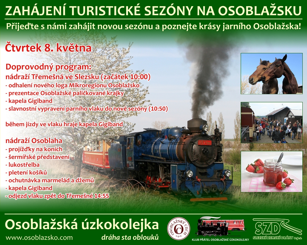V květnu je už hlavní turistická sezóna skoro za dveřmi. Pohled na uveřejněný jízdní řád výletních vlaků napovídá, jak bude letošní turistická sezóna na Osoblažské úzkokolejce vypadat. Na svátek 8. května je naplánována první veřejná jízda parního vlaku s oběma parními lokomotivami U57.001 „Malý štokr” a U46.002 „Rešica”. Důvod tohoto nasazení obou parních lokomotiv je zřejmý. Parní lokomotiva U57.001 „Malý štokr” má své kryté stání zajištěno v nově postavené výtopně ve stanici Třemešná ve Slezsku. Parní lokomotiva U46.002 „Rešica” absolvovala dne 7. května zkušební jízdu a během sezóny bude mít zajištěno stání ve výtopně v Osoblaze. na dopoledním vlaku Os20651 tak budou nasazeny obě parní lokomotivy a zpět na vlaku Os20650 se bude vracet poue parní lokomotiva U57.001 „Malý štokr”. Drobné změny jsou také v jízdním řádu. Stejně jako v uplynulém roce, odpadá při jízdě parního vlaku Os20651 čekání ve Slezských Rudolticích na předjetí pravidelným spojem Os20607. Ten přijíždí do Osoblahy až za parním vlakem. Také v měsíci červnu před slavnostním zahájením hlavní turistické sezóny bude jezdit dieselová lokomotiva TU38.001 „Faur” s výletními vlaky určenými především pro skolní výlety. Letos však budou tyto vlaky jezdit ve středu a čtvrtek. Od 21. června, kdy bude slaven „Den dráhy - 10 let provozu vlaků SZD” potom začíná hlavní turistická sezóna s parnímu vlaky o sobotách a nedělích. A protože je letos přece jen výročí, bude ve vybrané dny rozšířena nabídka výletních vlaků o další pár vlaků mezi Osoblahou a Slezskými Rudolticemi, které budou v režii parní lokomotivy U46.002 „Rešica”. Jízdní řád bude sestaven tak, že po příjezdu parního vlaku Os20651 do Osoblahy v 12:02 bude parní lokomotiva U57.001 „Malý štokr” odstavena od soupravy vlaku a v 12:40 bude vypravena souprava dvou výletních vozů s parní lokomotivou U46.002 „Rešica” do Slezských Rudoltic a zpět. Při zpáteční jízdě dojde v Bohušově ke křižování s pravidelným Os20608 jedoucím z Osoblahy do Třemešné ve Slezsku. Výletníci si tak mohou vybrat, jakým způsobem využijí volný čas v Osoblaze. Je vhodné průběžně sledovat plán jízd na stránkách Osoblažské úzkokolejky, kde jsou během roku upřesňovány termíny těchto doplňkových jízd. Toto vše nás však v letošním roce teprve čeká. Bylo by škoda nevyužít tento jarní sváteční den a nepořídit i záběry z jízd pravidelných vlaků. Také je těžké po tolika sezónách najít na trati další fotitelná místa. Tentokrát jsem využil jara, kdy vzrostlé pole nezakrývají v rovinaté krajině trať a více jsem se věnoval úseku mezi Bohušovem a Osoblahou. Trať v tomto místě vede jen 90m od hranic s Polskem a z okolních vyvýšených polí je dobrý výhled na celý úsek trati. Záběry z jízd pravidelných vlaků jen dokladují, že v tyto dny bývá souprava vlaků posílena o další vůz Balm/ú, aby bylo možné pobrat výletníky, kteří se chtějí vrátit z Osoblahy dříve. Další informační zdroje: