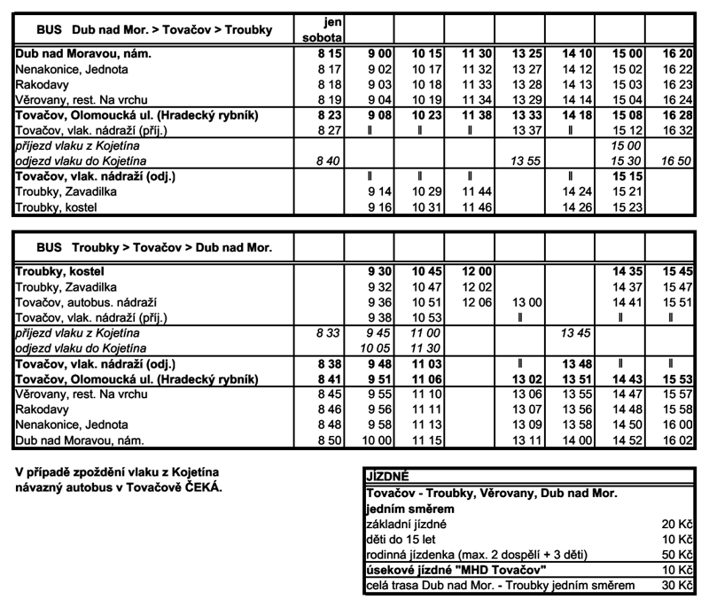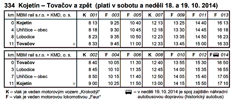 Po celý víkend jezdily po trati Kojetín - Tovačov zvláštní vlaky, které každý den odvozily po sedmi párech zvláštních vlaků. Na trati se střídaly dvě soupravy ve složení motorová lokomotiva LDH 125-038 „Faur” se dvěma vozy Bix a služebním vozem Daa-k a a samotný motorový vůz M286.0044 „Krokodýl”. Ten byl po oba dny nasazen na prvním ranním obratu 001/002 (Os 31252/Os 31253) a poledním 007/008 (Os 31258/Os 31259). Na posledním nedělním vlaku O14 (Os 31265) z Tovačova do Kojetína měl být nasazen historický autobus jako NAD, protože souprava vlaku měla zůstat v Tovačově na vlečce Toposu. Ovšem kvůli technologickým záležitostem plánované výluky byla souprava převezena do Chropyně. Po příjezdu Os 31264 do Tovačova a přípravě soupravy odjel vlak jako Sv přibližně v 17:05 do Kojetína. Tam byla souprava doplněna o motorový vůz M286.0044 „Krokodýl” a celá souprava přejela už za tmy do Chropyně.