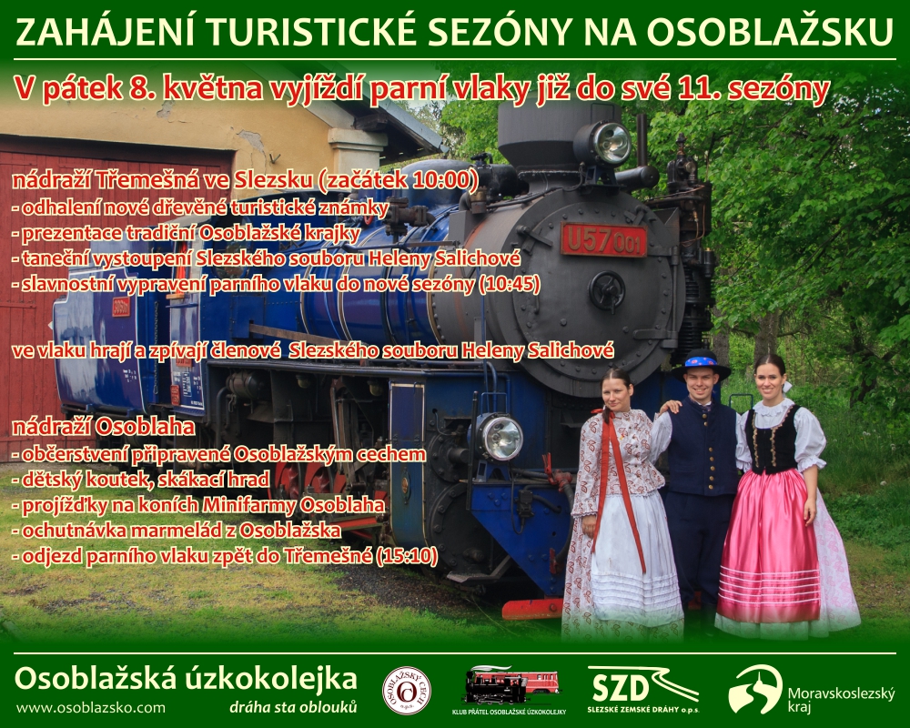 Parní lokomotiva U57.001 „Malý štokr” má celoročně zajištěné stání v jednomístné výtopně ve stanici Třemešná ve Slezsku. Zde ve stanici také celoročně přebývá dieselová lokomotiva TU38.001 „Faur” a souprava vozů výletního vlaku. Parní lokomotiva U46.002 „Rešica” je mimo sezónu deponována v Krnově a do Třemešné ve Slezsku bývá převezena před zahájením sezóny. Během turistické sezóny je tato parní lokomotiva ustájena v remíze v Osoblaze. Tato remíza se dvěma kolejemi s kapacitou až pro čtyři lokomotivy je v současnosti využívána pouze částečně. Z motorových lokomotiv ČD, které zajišťují vozbu pravidelných osobních vlaků, se zde nacházejí pouze rekonstruovaná lokomotiva 705 913-2, která zajišťuje téměř veškerý provoz pravidelných osobních vlaků, a původní 705 914-0, která slouží jako záloha. Jízdní řád trati 298 Třemešná ve Slezsku - Osoblaha je v podstatě stejný jako v minulém období 2013/2014. Změny v časových polohách vlaků jsou pouze minutové. Co se týče výletních parních vlaků Os 20651 a Os 20650, tak došlo pouze k významnějšímu posunu času odjezdu odpoledního vlaku z Osoblahy. Stejně jako v loňském roce se podařilo zkrátit odpolední pobyt ve Slezských Rudolticích na nezbytný čas kvůli křižování s protijedoucím Os 20609. V průběhu června a září budou parní vlaky jezdit pouze o sobotách a během letních prázdnin budou úzké koleje brázdit parní vlaky všechny víkendové dny. Pro letošní sezónu je také připravena nová turistická známka, která nahradí dříve vydanou turistickou známku 0817. Slavnostní parní vlak při zahájení turistické sezóny byl opět z Třemešné ve Slezsku veden oběma parními lokomotivami. Zájem o svezení byl značný, neboť vydaná tisková zpráva slibovala bohatý doprovodný program před odjezdem vlaku v Třemešné ve Slezsku, který bude potom pokračovat v Osoblaze mezi 12. a 15. hodinou. Obě parní lokomotivy si musely pří jízdě do Osoblahy poradit se soupravou prodlouženou o dva vozy Balm/ú. Pro zpáteční návrat do Třemešné mohli návštěvníci využít pravidelný Os 20608. Parní lokomotiva U46.002 „Rešica” zůstává v Osoblaze po celou letní sezónu a odpolední parní vlak Os 20650 zkrácený o jeden vůz Balm/ú odvezla parní lokomotiva U57.001 „Malý štokr” sama. Tradičně využívám návštěvu Osoblažky také ke zdokumentování pravidelných osobních vlaků. Nejinak tomu bylo i při této návštěvě už od ranního vlaku Os 20603. Některé pravidelné vlaky byly posíleny o další vůz Balm/ú z důvodu předpokládaného většího počtu návštěvníků v regionu. Počasí po většinu dne přálo a záběry z klasických známých míst tak nemohly chybět. Mohl jsem také porovnávat, jak rychle se zazelenala příroda od posledního jarního výletu na Osoblažsku před měsícem. Skutečně pouhý měsíc stačil k tomu, aby některá oblíbená fotomísta povážlivě zarostla. Další informační zdroje: