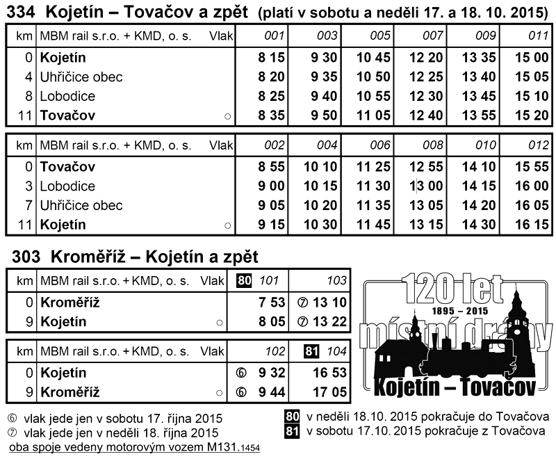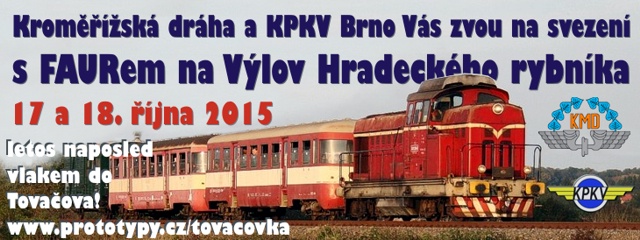 Jak bývá tradicí, na trati se při zvláštních akcích objevují různé zajímavé soupravy vlaků. Pro letošní jízdy byla původně plánovaná a na plakátech ohlášená lokomotiva LDH 125-038 „Faur”, která už jezdila v loňském roce na stejné akci se soupravou dvou vozů Bix a služebním vozem Daa-k. Tato souprava se na trati střídala s motorovým vozem M286.0044 „Krokodýl”. Pro mnoho železničních fanoušků byla lokomotiva LDH 125-038 „Faur” příjemným překvapením pro její zajímavý zvuk motoru. Bohužel kvůli vážné technické závadě nebylo možné lokomotivu však před termínem konání akce zprovoznit a na poslední chvíli byla ohlášena změna v nasazení vozidla. V čele zvláštních vlaků měla stanout lokomotiva řady 740. Ani ohlášená 740 899-0 se však na trať nakonec nedostala a v sobotu ráno přijela lokomotiva 740 770-3. Doprava byla posílena i v úseku Kroměříž - Kojetín o jeden pár vlaků vedený motorovým vozem M131.1454 „Hurvínek”. Pro cestující na výlov do Tovačova nebyla změna hnacího vozidla až tak podstatná. Souprava vlaku byla tvořena dvěma vozy Blm s kamínky na tuhá paliva, jedním vozem Blm, který dovezl M131.1454 „Hurvínek” z Kroměříže, a služebního vozu Daa-k. Na letošní poslední jízdy na Tovačovce jsem se vypravil až v neděli. Počasí opět nezklamalo. V tuto roční dobu a v této oblasti plné rybníků a jezer bývají ranní mlhy časté a mnohdy se rozplynou až před polednem. Nejinak tomu bylo i letos. V sobotu bylo počasí poněkud přívětivější bez mlh, ale i bez sluníčka. Naopak nedělní mlha trvající až do oběda se poté definitivně rozpustila a odpoledne se na chvíli objevilo i to vytoužené sluníčko. I přes celkovou nepřízeň počasí byly vlaky hojně využívány. V sobotu je bylo možné využít i v obrácením směru z Tovačova do Kojetína na již 7. ročník Hubertovy jízdy. O zdárný průběh celé akce se opětovně starali členové občanského sdružení Kroměřížská dráha (KMD). Ve vlacích bylo také možné zakoupit drobné propagační materiály. Těmito podzimními jízdami pro letošní rok skončil bohatý provoz zvláštních vlaků na Tovačovce a na další jízdy si musíme počkat až do května příštího roku. Další informační zdroje: