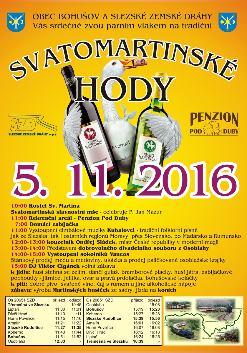 Připravená souprava vlaku počítala s chladnějším počasím. Kromě tří otevřených výletních vozů byly na konec soupravy zařazeny dva kryté vozy Balm/ú. První v barevné kombinaci zelená-slonová kost ladí ke zbytku soupravy a nese označení vlastníka Slezských zemských drah (SZD). Druhý, posilový vůz, v původním „polomáčeném“ barevném schématu patří ČD. Ještě před odjezdem zvláštního parního vlaku v 10:45 byla slavnostně předána do užívání další novinka, ozvučení soupravy parního vlaku, které financoval Mikroregion Krnovsko. Během cesty tak mohou být turisté seznámeni se zajímavosti a památkami v okolí projížděné trati. Takovéto využití ozvučení vlaků není v České republice běžné, a proto SZD čerpají inspiraci z obdobných turistických vlaků ze zahraničí. V 10:45 se parní vlak Os20651 vydává na cestu a hned v prvním stoupání za Třemešnou je znát, že se topič na parní lokomotivě U57.001 „Malý štokr“ dnes zapotí. Přece jen dva těžké vozy Balm/ú na konci vlaku jsou znát. I přes typické podzimní počasí jsou zaplněny i otevřené výletní vozy. O pohodu všech cestujících se cestou stará osazenstvo pivního vozu, které v tomto počasí nabízí teplejší a energetičtější nápoje. Pro většinu cestujících je cílem cesty ve 12:51 Bohušov, odkud je to do rekreačního areálu coby husím stehýnkem dohodil. Souprava téměř prázdného vlaku pokračuje až do Osoblahy s příjezdem ve 12:03. Jak bylo avizováno, na zpáteční jízdu bude výkon parní lokomotivy U57.001 „Malý štokr“ posílen o parní lokomotivu U46.002 „Resita“. Ta během letní turistické sezóny měla své stání zajištěno v remíze v Osoblaze a ve vyhlášených termínech byla nasazována na doplňkové parní vlaky, které zajížděly z Osoblahy do Slezských Rudoltic a zpět. Teď na konci sezóny se na vlaku Os20650 přesune zpět z Osoblahy do depa v Třemešné. Letos by měla absolvovat ještě Mikulášskou jízdu, poslední jízdu v tomto kalendářním roce. Na zpáteční jízdu se parní vlak Os20650 vydal z Osoblahy v 15:08 v čele s oběma parními lokomotivami. V Bohušově nabral cestující do Třemešné ve Slezsku a vzhledem k tomu, že se odpoledne začalo více ochlazovat, přednost dostaly oba vytápěné vozy Balm/ú řazené hned za parními lokomotivami. Při zpáteční jízdě světla rychle ubývalo a do Třemešné ve Slezsku přijížděl parní vlak v 16:39 už za tmy. Několik záběrů dokumentuje jízdu zvláštního parního vlaku, ovšem chybí záběry z jízd pravidelných vlaků. Pouze několik statických prostřihů dokumentuje odstavené lokomotivy 705 917-3 v Třemešné ve Slezsku a 705 914-0 v Osoblaze. Krátký sestřih trochu zpestřují záběry z dění v Osoblaze, kdy po příjezdu parního vlaku Os20651 už stála před remízou roztopená lokomotiva U46.002 „Resita“. Sychravé poledne vyplnil následný posun a zbrojení obou parních lokomotiv a zbylo dost času na přejezd do Bohušova na Svatomartinské hody. Po občerstvení a zahřátí v Bohušově jsme stihli zrovna parní vlak Os20650 na odjezdu z Osoblahy v 15:08. Několik dalších záběrů zachycuje tandem obou parních lokomotiv při zpáteční jízdě. Světelné podmínky se ovšem každou minutou velmi zhoršovaly a tak ne každý záběr byl použitelný. Poslední v Třemešné ve Slezsku jen dokumentuje odstoupení parní lokomotivy U46.002 „Resita“ od vlaku, zatímco parní lokomotiva U57.001 „Malý štokr“ ještě za tmy odvedla kus práce při úklidu vozů soupravy vlaku. Několika větami bych se ještě pozastavil u současné situace s vozovým parkem na Osoblažce, která bohužel není vůbec optimistická. Ještě před několika lety byly na Osoblažce dislokovány celkem čtyři lokomotivy - 705 916-5, 705 917-3, 705 914-0 a 705 913-2 (jediná rekonstruovaná). V roce 2014 byla lokomotiva 705 916-5 jako neprovozní odvezena do Muzea ČD v Lužné u Rakovníka. Další lokomotiva 705 917-3 je dlouhodobě neprovozní a je odstavena na kusé koleji v Třemešné ve Slezsku. Provoz pravidelných osobních vlaků tak mají zajišťovat lokomotivy 705 913-2 a 705 914-0 (v roli zálohy). Ovšem od června po závadě na motoru je lokomotiva 705 914-0 neprovozní, odstavená na kusé koleji v Osoblaze, kde dříve stávaly ostatní neprovozní předchůdkyně. Vozbu pravidelných osobních vlaků nyní zajišťuje jediná lokomotiva 705 913-2, ovšem bez zálohy a při jakékoliv závadě tak trať osiří a na úzké silničky musí vyrazí autobus. Tento stav nastal i tento týden, kdy je od 1. listopadu ohlášena NAD z důvodu poruchy lokomotivy s předpokládanou dobou trvání do 18. listopadu. Další informační zdroje: