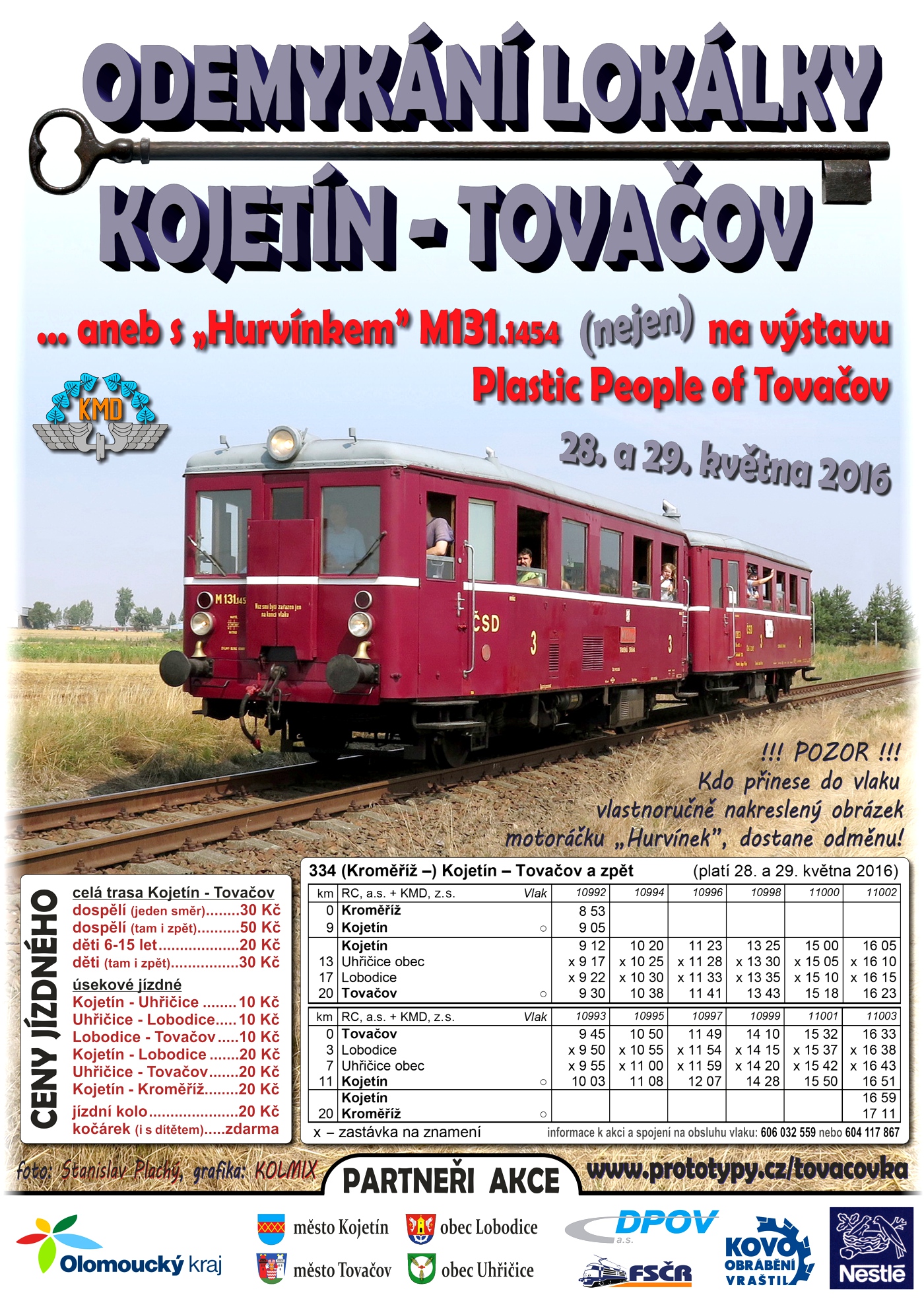 Na oba víkendové dny 28. a 29. května bylo naplánováno vždy po šesti párech zvláštních vlaků mezi Kojetínem a Tovačovem. Na sobotu bylo plánováno nasazení soupravy motorového vozu M131.1454 „Hurvínek“ s přívěsným vozem Blm. Na tento den byla také očekávána vyšší frekvence cestujících s ohledem na konání dalšího ročníku setkání plastikovým modelářů Plastic People of Tovačov ve sportovní hale v Tovačově. V neděli zajišťoval všechny jízdy jen samotný motorový vůz M131.1454 „Hurvínek“. Krátká reportáž několika záběry přibližuje zvláštní jízdy sólo jezdícího motorového vozu v neděli 29. května. První ranní spoj Os 10992 byl vypraven jako přímý v 8:53 z Kroměříže do Tovačova. Obdobně jako přímý byl zase veden poslední odpolední spoj Os 11003 v 16:33 z Tovačova do Kroměříže, neboť v tamní remíze měl motorový vůz M131.1454 „Hurvínek“ zajištěno zázemí. Ostatní spoje, jak již bylo zmíněno, odjezdil motorový vůz mezi Kojetínem a Tovačovem s jízdní dobou 18 minut. Všechny vlaky stavěly kromě zastávky (nákladiště) Lobodice ještě na kdysi existující zastávce Uhřičice obec. Ačkoliv výskyt motorového vozu „Hurvínek“ není na této lokálce nic mimořádného, je ostatně typickým zástupcem motorových vozů dříve jezdících po lokálkových tratích, bylo pro výlet příjemné jarní počasí a po zimní absenci o to větší důvod na „Tovačovku“ vyrazit. Jízdy zvláštních vlaků byly doprovázeny průvodčími v dobových uniformách a ve vlaku bylo možné zakoupit předměty s železniční tematikou. Kromě jízdenek na různé tarifní vzdálenosti bylo možné podpořit provoz vlaků na trati Kojetín - Tovačov zakoupením některé ze dvou příspěvkových jízdenek. Další informační zdroje: