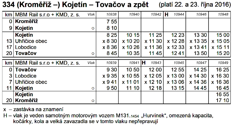 Ačkoliv na místní trati z Kojetína do Tovačova není od roku 1981 provozována pravidelná osobní doprava, objevují se několikrát ročně na trati aspoň zvláštní osobní vlaky spojené s jinými akcemi konanými v Kojetíně, Tovačově či nejbližším okolí. Trať je však udržována v dobrém technickém stavu, neboť je na ní stále provozována nákladní doprava. V současnosti se po trati vozí dvoje komodity. Ze Skašova to jsou ucelené soupravy se šterkem a z vlečky TOPOS PREFA Tovačov to jsou ucelené soupravy nízkostěnných vozů Res ložené velkými betonovými dílci. Letos bylo na po oba víkendové jízdy naplánováno celkem 12 párů zvláštních vlaků. O vozbu těchto vlaků se měly podělit dieselová lokomotiva LDH 125-038 „Faur“, T444.1516 „Karkulka“ a motorový vůz M131.1454 „Hurvínek“. Přitom motorový vůz M131.1454 „Hurvínek“ s jedním přívěsným vozem Blm měl na starosti ještě vozbu zvláštních vlaků Os 100938 a Os 10949 mezi Kroměříží a Kojetínem. Samotný motorový vůz také po oba dny zajišťoval obrat poledních vlaků Os 10943/Os10944 z Tovačova do Kojetína a zpět. Dieselová lokomotiva T444.1516 „Karkulka“ momentálně přebývá v remíze na nedaleké vlečce TOPOS PREFA Tovačov a měla se o víkendu zapojit do vozby zvláštních vlaků Os 10939 až Os 10948 (kromě již zmíněného poledního obratu Os 10943/Os 10944) spolu s dieselovou lokomotivou LDH 125-038 „Faur“. Ta jako Os 182320/104029 dojela v sobotu ráno z Brna, dovezla další dva přívěsné vozy Blm s kamínky a pokračovala z Kojetína do Kroměříže s celou soupravou jako Os 10938. Podobně tak v neděli odpoledne jela na posledním vlaku Os 10949 z Tovačova do Kojetína a odtud jako Os 100828/104152 se dvěma přívěsnými vozy Blm s kamínky pokračovala zpět do Brna. Pro zdokumentování podzimních jízd zvláštních vlaků jsem počítal s oběma víkendovými dny. Předběžně byl oznámeno, že o vozbu se podělí jeden den dieselová lokomotiva T444.1516 „Karkulka“ a druhý den LDH 125-038 „Faur“. Bohužel se vyskytly během návozu soupravy z Brna technické problémy a bylo tak rozhodnuto, že dieselová lokomotiva LDH 125-038 „Faur“ odjede pouze první sobotní vlak Os 10939 z Kojetína a poslední nedělní Os 10949 z Tovačova a vozba všech ostatních bude zajištěna dieselovou lokomotivou T444.1516 „Karkulka“. Naopak co nás nemohlo zklamat a s čímž jsme dopředu počítali, bylo typické podzimní tovačovské počasí do jisté míry ovlivněné množstvím okolních rybníků. Typická podzimní mlha v sobotu vydržela až do poledne a slunce nás nesmělo ohřálo až v odpoledních hodinách. V neděli přesně podle předpovědi počasí nás slunce ohřívalo jen dopoledne a odpolední záběry nám znepříjemňoval silný vítr, který s sebou od jihu přinesl hradbu oblačnosti. Pořadatelem letošních podzimních jízd bylo tradičně občanského sdružení Kroměřížská dráha (KMD), jehož členové se starali o zdárný průběh akce a také o tepelnou pohodu v přívěsných vozech Blm vytápěných kamínky. Kromě toho bylo možné ve vlacích zakoupit drobné propagační materiály nebo přispět na jízdy vlaků zakoupením upomínkových jízdenek. Další informační zdroje: