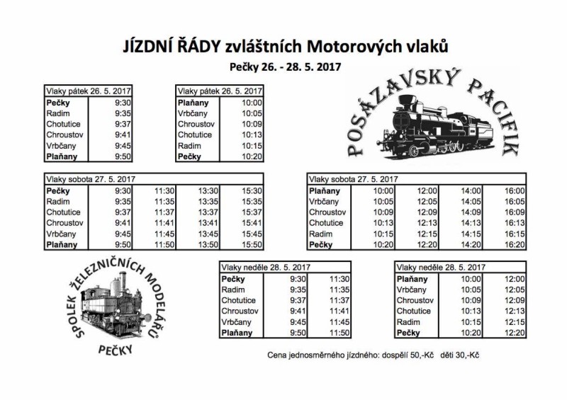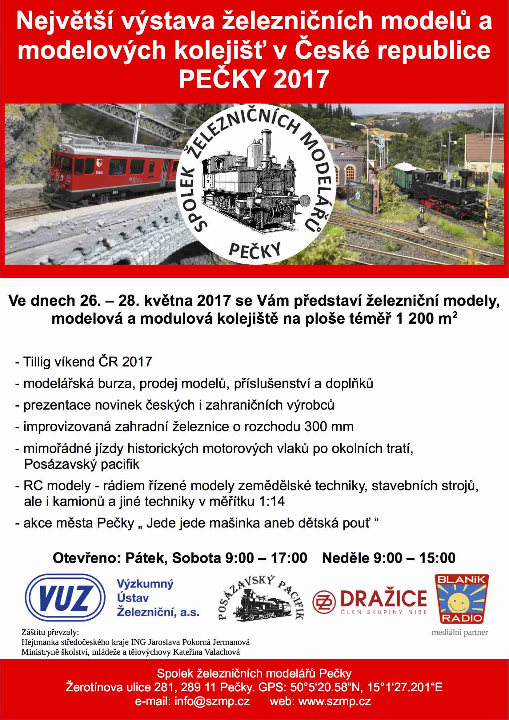 Zastavme se ještě chvíli u našeho zlatého modelářského měřítka - modelové velikosti TT. Tato víkendová akce je zároveň označována jako „Tillig TT víkend modelářů v ČR“. Mnozí si ještě pamatují, že původní myšlenka setkání modelářů zlatého středu, velikosti TT, byla pořádána ve Všestarech nedaleko Hradce Králové včetně doprovodného programu a jízd zvláštních vlaků po okolních tratích. Takto se Deltaxu podařilo zorganizovat celkem 12 ročníků těchto TT víkendů, byť poslední ročníky již měly sestupnou tendenci. Kdo by hledal informace o těchto dávno minulých akcích v nekonečné pavučině Internetu, bude bohužel zklamán. Ale vraťme se do Peček. Víkendová akce města „Jede, jede mašinka aneb dětská pouť v Pečkách“ má také svoji historii. Modeláři v Pečkách se aktivně spoluúčastní na pořádání tohoto tematicky zaměřeného víkendu. Kromě výstav železničních modelů a modelových kolejišť jsou pořádány jízdy zvláštních vlaků po okolních tratích, ale i výstava železničních vozidel ve stanici Pečky. Je nabíledni, že s ukončením „TT víkendů“ ve Všestarech přešly tyto aktivity do Peček. Přitom kluboví modeláři neomezují jen na velikost TT, ale prezentují modelová kolejiště ve všech běžných modelových velikostech včetně improvizované zahradní železnici o rozchodu 300 mm. Návštěvníci výstavy mohou také zavítat o pár bloků domů dále, do ulice 5. května, kde sídlí modelářská prodejna Františka Dvořáčka. Letošní akce „Mašinka 2017“ v Pečkách probíhala od pátku 26. května do neděle 28. května. Stejně tak jízdy zvláštních motorových vlaků po trati 012 z Peček do Plaňan, letos zajišťované spolkem Posázavský Pacifik, byly od pátku do neděle a na trať vypraveno celkem 7 párů motorových zvláštních vlaků. Bohužel mi letos povinnosti nedovolily zúčastnit se akce v Pečkách v plném rozsahu. V podstatě jsem se zastavil v regionu jen v neděli jen letmo, cestou kolem. Jen jsem se na chvíli zastavil u trati a pořídil několik záběrů. Okolí trati od svého znovuotevření v roce 2014 opětovně zarůstá bujnou vegetací. Můžeme si jen krátce připomenout, že při záplavách v roce 2013 se rozvodnil jinak poklidný tok říčky Výrovka a železniční trať v jejím dosahu byla poškozena. Náročná oprava trati, včetně kompletní rekonstrukce stanice Plaňany, trvala celý rok. Od 28. června 2014 byl provoz na trati obnoven v celém rozsahu. Okolí trati bylo vyčištěno, železniční trať musela být v okolí říčky Výrovka mnohde obnovena včetně železniční pláně a odstranění sesunutých svahů. Stačily však dva tři roky a bujná vegetace zahladila stopy povodně a následných prací. To je vidět i na několika pořízených záběrech z okolí přírodní rezervace Stráně u splavu v úseku Chroustov - Vrbčany. Další informační zdroje: