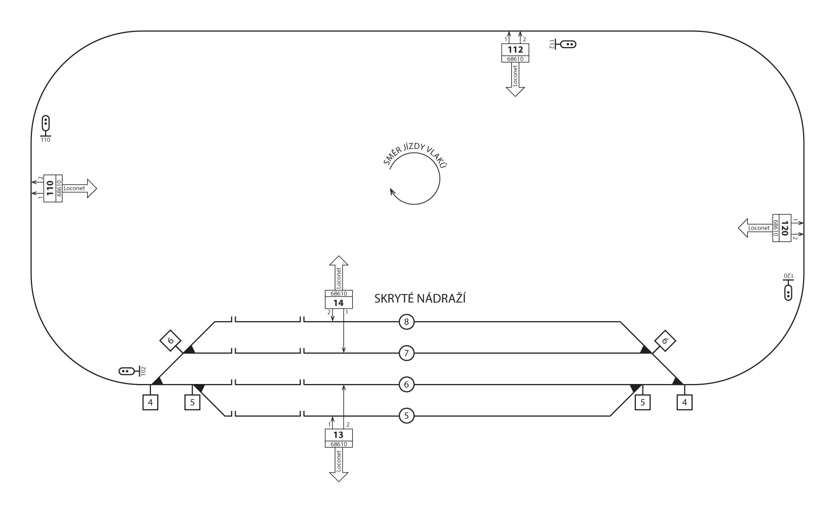 navazují přímo na dříve popsané skryté nádraží. Doplněním dalšího traťového oddílu dostaneme následující schéma: