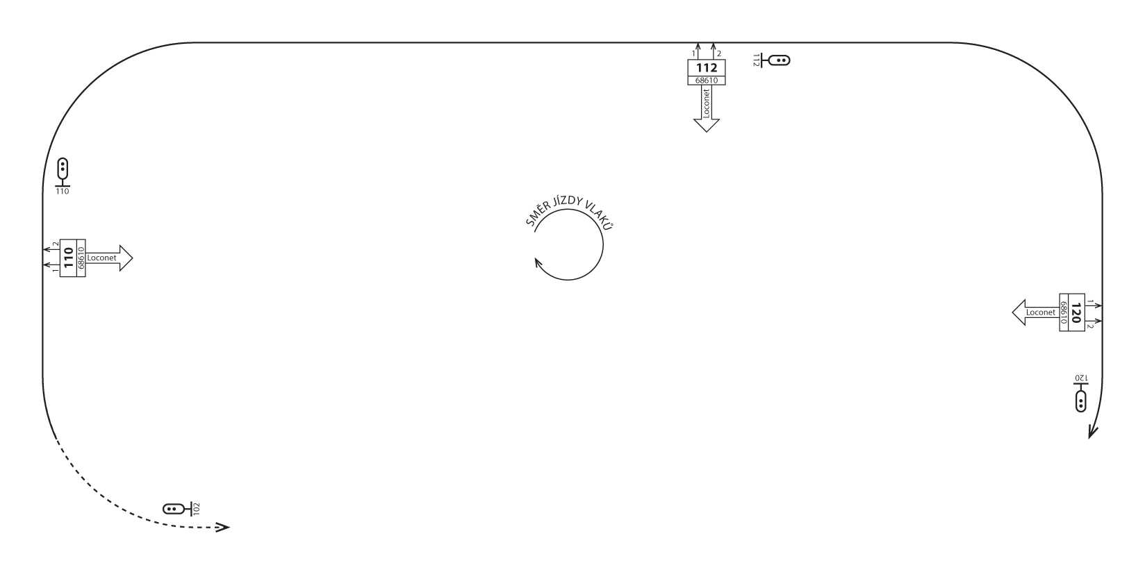 - Ve výchozím stavu jsou všechny traťové oddíly prázdné. Soupravy vlaků jsou ve skrytém nádraží.
