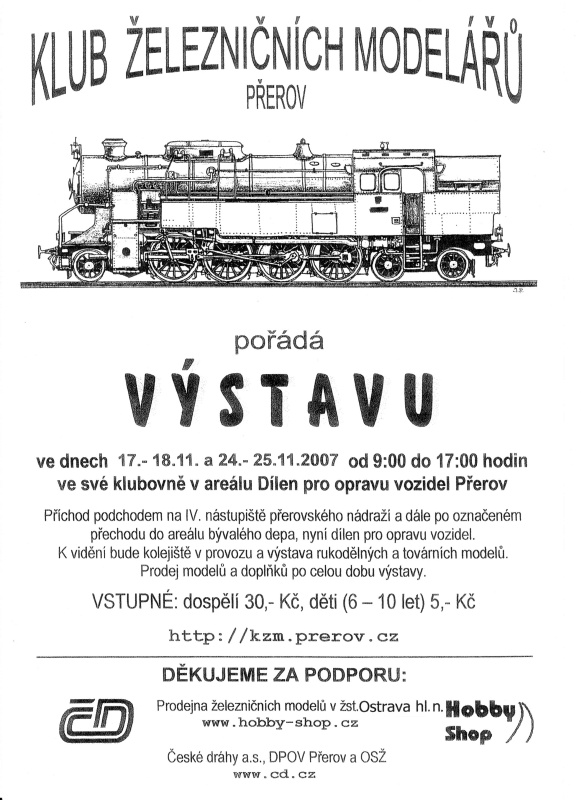 letak07x.jpg černobílý sken letáku pozvanka07.jpg pozvánka na výstavu výstava 2006 reportáž z minulého ročníku výstavy, kde jsou i odkazy na reportáže z předchozích výstav, které jsem navštívil kzm.prerov.cz internetové stránky Klubu železničních modelářů Přerov www.hobby-shop.cz internetový obchod Hobby Shop s.r.o., jednoho ze sponozorů výstavy |