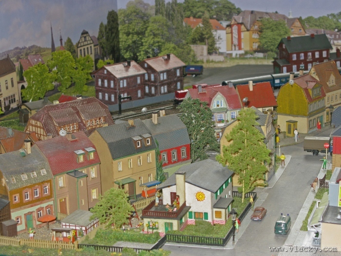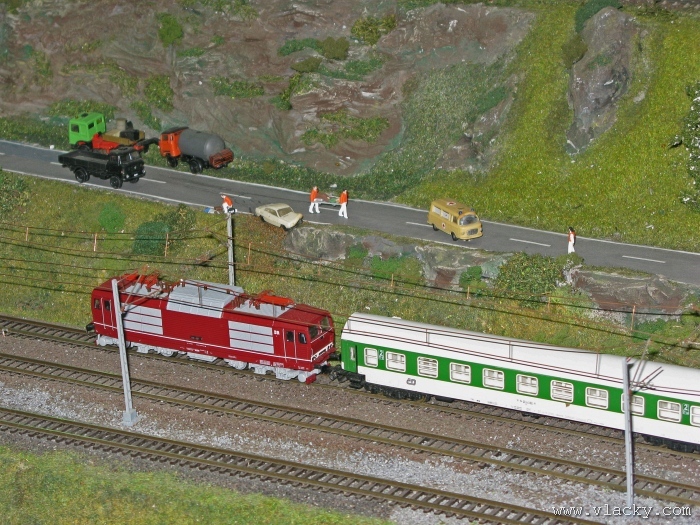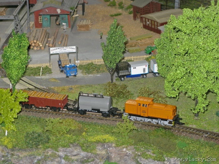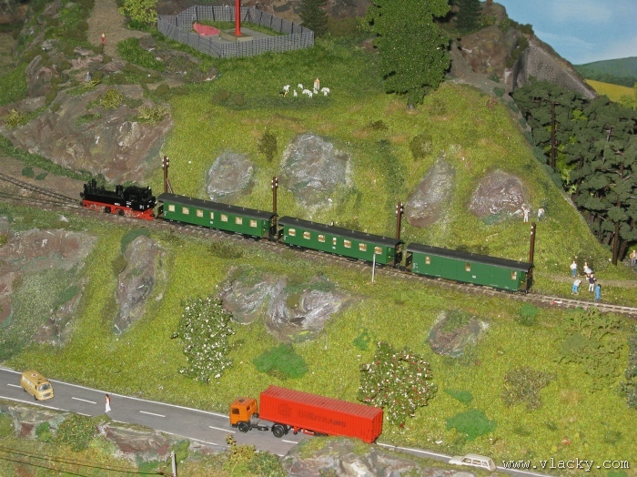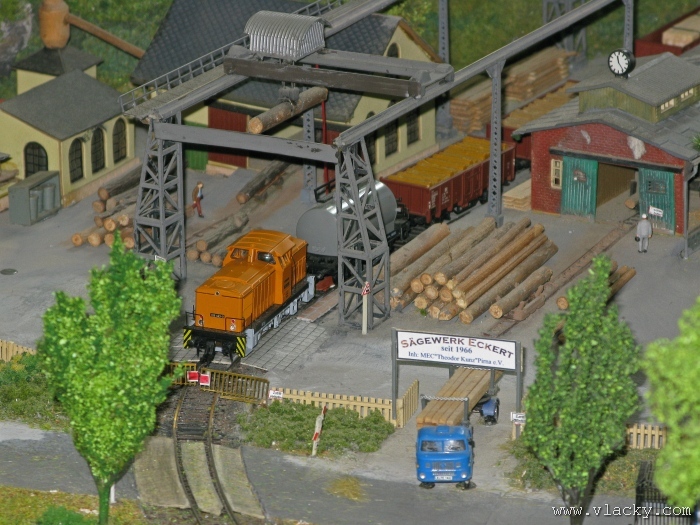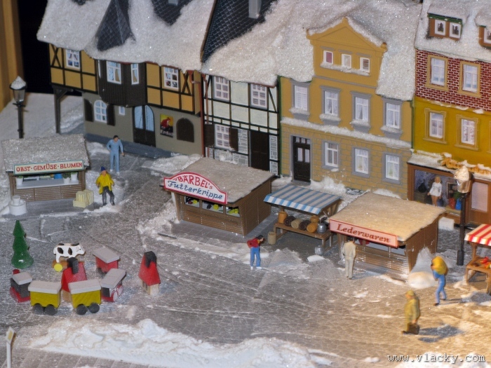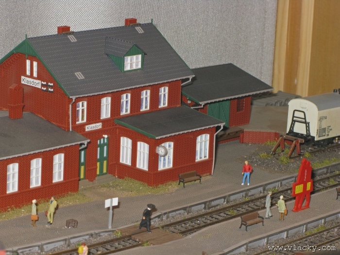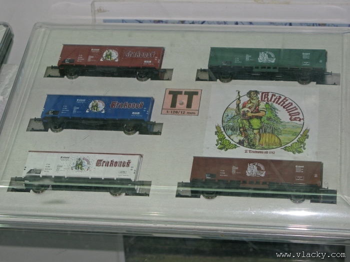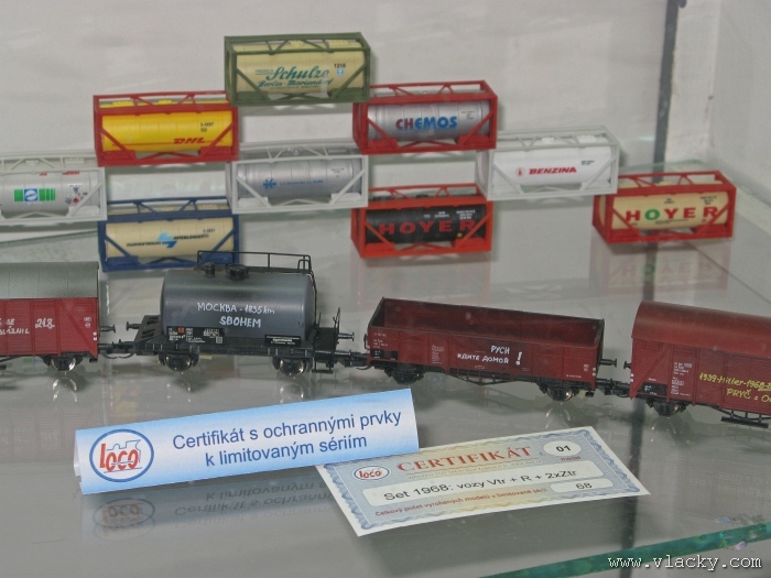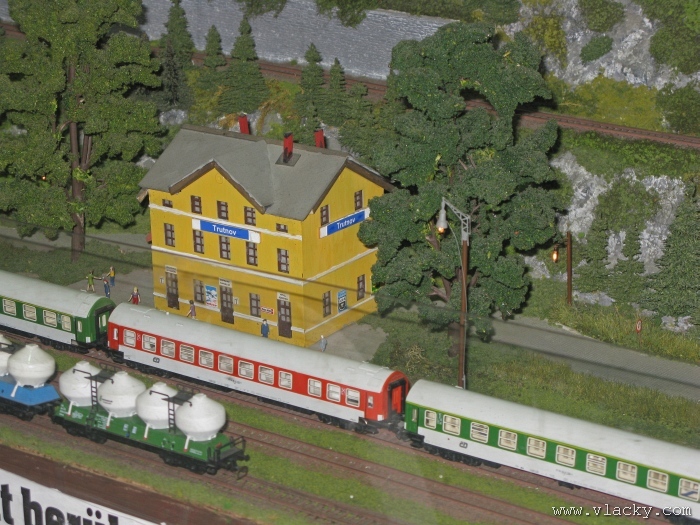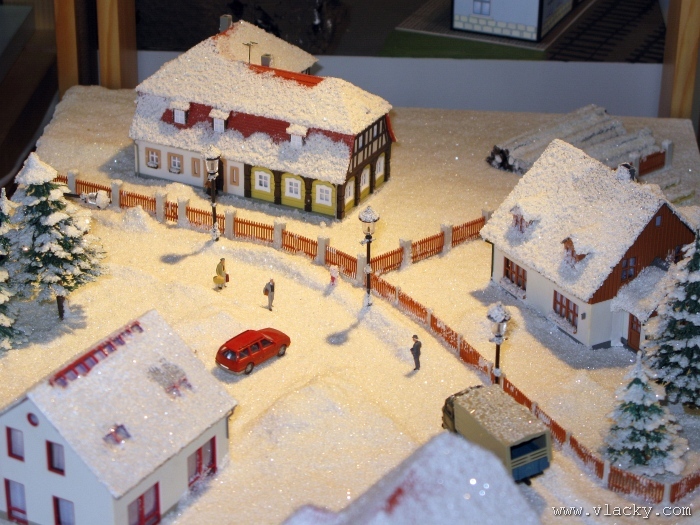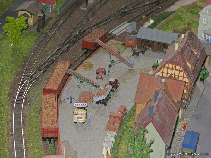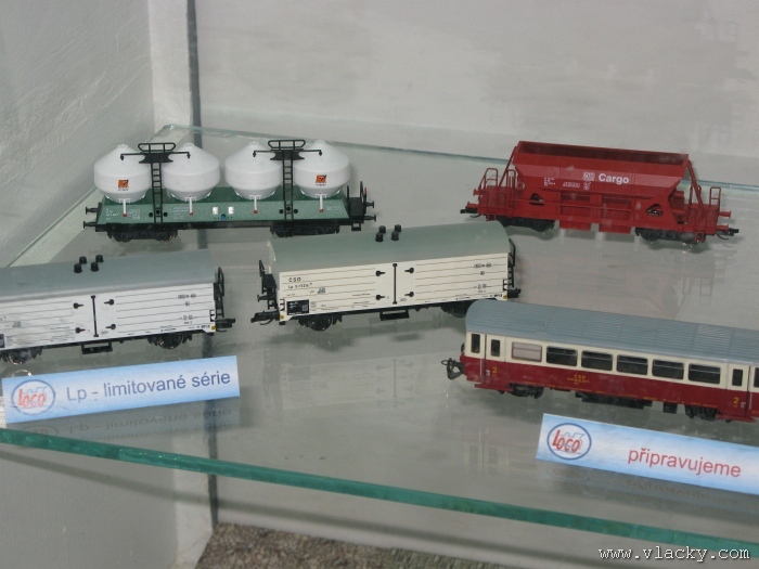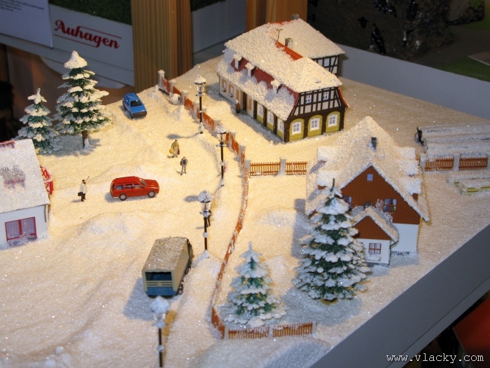 Rychle jsem přešel přes město k tělocvičně ZŠ Komenského, kde se výstava konala. Asi nejvíce času jsem strávil u největšího kolejiště z Německa, samozřejmě v "mé" modelové velikosti TT. Hlavním námětem bylo velké nádraží, které mělo vlevo odstavné a nákladové nádraží a vpravo byla velká hala osobního nádraží. Vzadu se pyšnilo velké lokomotivní depo. Hlavní dvojkolejná trať se klikatila krajinou a mizela v tunelu, kde pokračovala do skrytých nádraží. Po hlavní trati se proháněly dlouhé soupravy vlaků, osobní vlaky a rychlíky zajížděly do haly osobního nádraží, nákladní vlaky projížděly kolem a zastavovaly až v nákladním nádraží, případě jako NEx pokračovaly dále. V popředí tohoto velkého nádraží bylo v náznaku vymodelováno město s výškovými budovami a v přednádraží panoval čilý dopravní ruch. V pravé části kolejiště byla malá stanička na úzkorozchodné trati, po které občas projel výletní parní vlak. V levé části kolejiště mě zaujala lokálka, která zajišťovala dopravní oblužnost menšího městečka. Byl pracovní den, na lokálce vrcholila řepná kampaň a z místní pily byly odváženy vozy Es naložené dřevem. Na tomto kolejišti se mi líbilo dobře zpracované pozadí, které při pohledu na kolejiště dodávalo pocit správné perspektivy. Další část výstavní plochy patřila firmě Auhagen s jejími diorámaty. Bylo možné vidět i zajímavé zpracování zimních motivů se vším, co k zimě patří, např. předvánoční stánkový prodej nebo zasnšžené nádraží s odhrnutými kopami sněhu. Ve vitrinách vystavovala firma Loco zajímavé sety, které byly vyráběny na zakázku a vůbec tak nepřišly do prodejní sítě. Dále zde byla ukázka současné produkce s tolik ohlašovaným novým samovýsypným vozem Facs/Sas. Tento vůz je přepracován z nových forem a vybaven kinematikou. Technickým zpracováním se tak dostává na úroveň továrních modelů Tillig, cenově je však převyšuje. Tyto vozy určené k prodeji budou ve srovnání s tímto vystavovaným vzorkem jednodušší. Budou mít jen základní potisk, zcela bude chybět potisk na rámu, budou bez krycích klapek a nebudou nabarveny kotvy, plošiny a nárazníky. Firma Tillig kromě nezbytného ukázkového kolejiště představila ve vitrinách nejnovější modely. Zmínil bych např. připravovanou elektrickou lokomotivu BR 189 a připravovaný nákladní vůz na uhelný prach. Téměř hotova je elektrická lokomotiva BR 103, která bude vyráběna v kooperaci s firmou Beckmann. K vidění na výstavě toho bylo samozřejmě daleko více. Zmíním třeba kolejiště s námětem divokého západu v modelové velikosti H0, nebo další kolejiště v modelové velikosti TT s námětem provozu na českých tratích. Kolem byly další vitríny s produkcí méně známých malosériových výrobců. Nesmím ani opomenou velké klubové kolejiště KŽM Trutnov, které vídávám pravidelně na modelářských výstavách. Právě na tomto kolejišti měly svou premiéru nové modely samovýsypných vozů Facs/Sas od firmy Loco. V ostrých obloucích na dvojkolejné trati působila ucelená souprava těchto vozů velmi dobře. To vše bude ke shlédnutí ve videoklipu. Další informační zdroje: