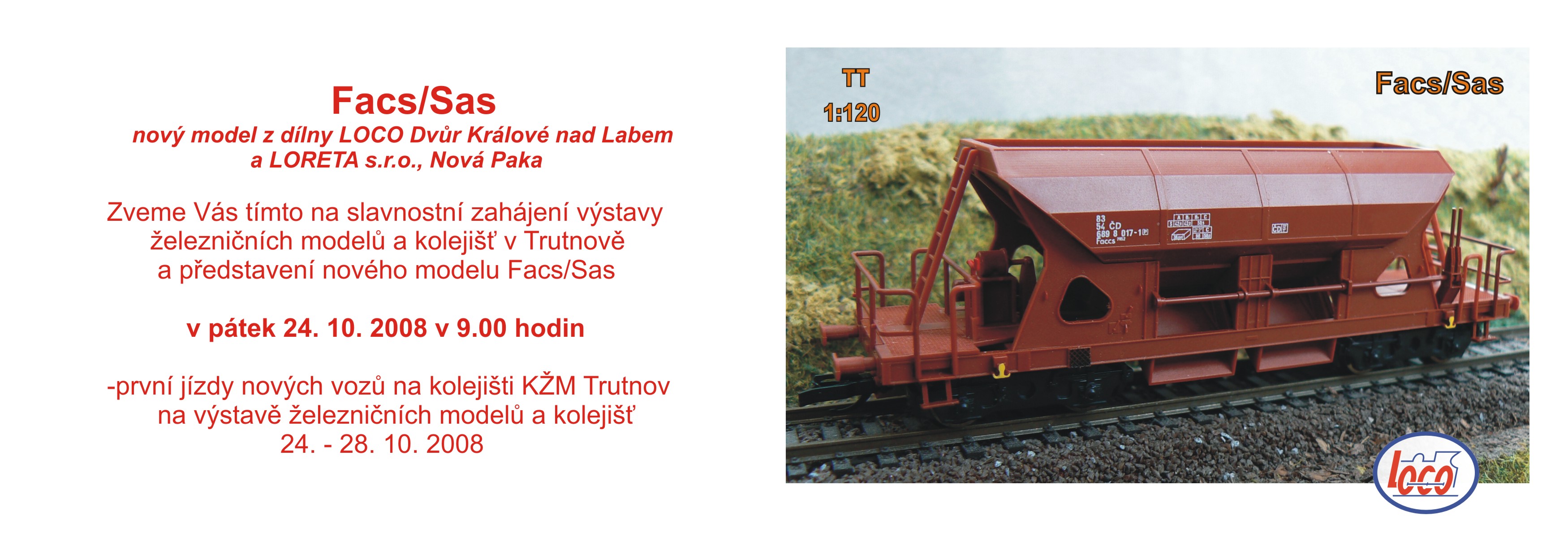 vystava_trutnov.jpg plakát k této akci trutnov_poznavka.jpg pozvánka na slavnostní zahájení výstavy s představením nového vozu Facs/Sas firmy Loco KŽM Trutnov webové stránky klubu Loco malosériový výrobce železničních modelů a příslušenství TT Tillig hlavní výrobce železničních modelů TT Auhagen výrobce doplňků pro železniční modelářství, převážně staveb a příslušenství pro stavbu krajiny VERAMO CZ trutnovský prodejce příslušenství modelové železnice, který měl na výstavě svůj stánek k032.pdf jízdní řád trati Jaroměř - Trutnov k045.pdf jízdní řád trati Trutnov - Svoboda nad Úpou, dopravce Viamont, a.s. |
