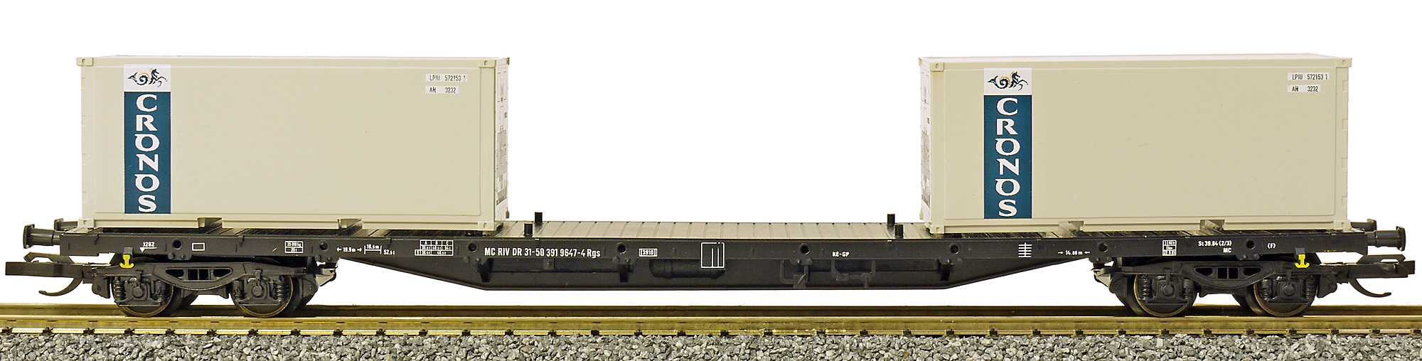 | nákladní plošinový vůz černý se dvěma 20' kontejnery „CRONOS“ |