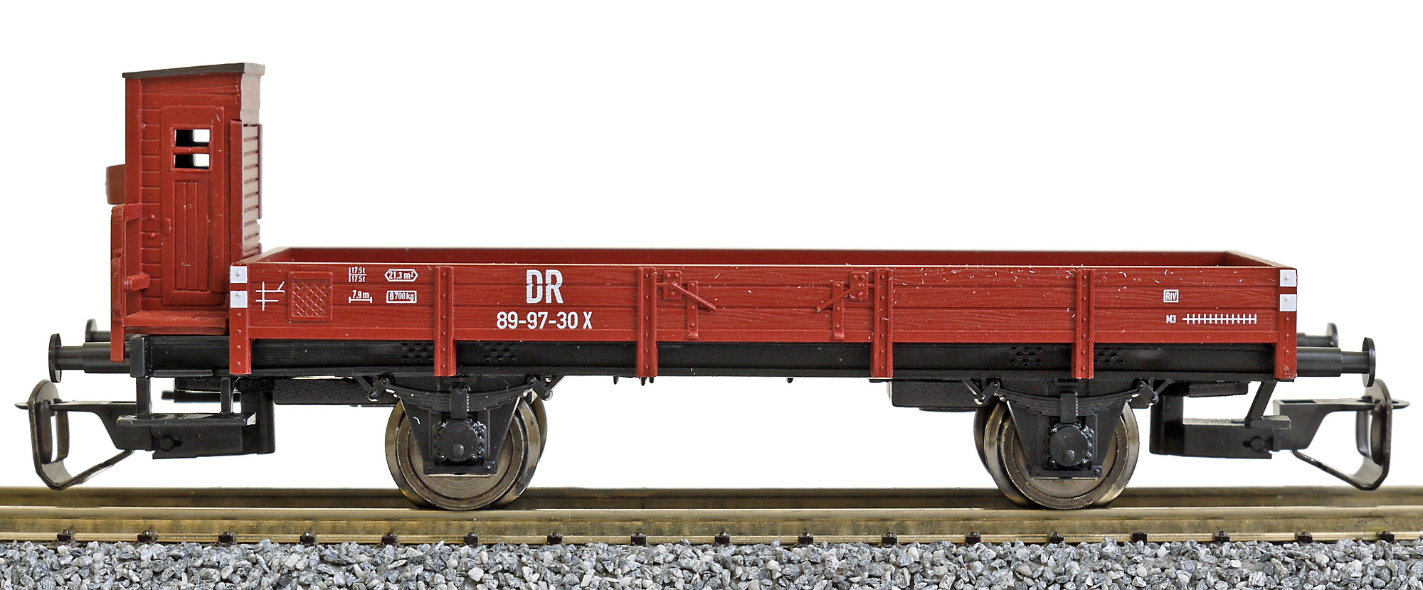 | nízkostěnný nákladní vůz červenohnědý s brzdařskou budkou |