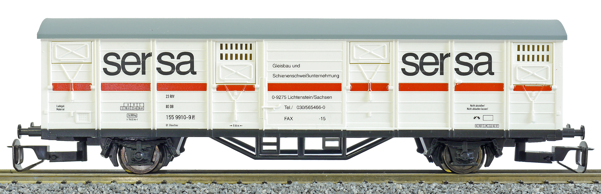 | krytý nákladní vůz bílý s šedou střechou „Gleisbaufirma sersa“ |