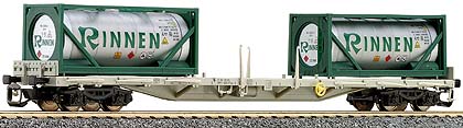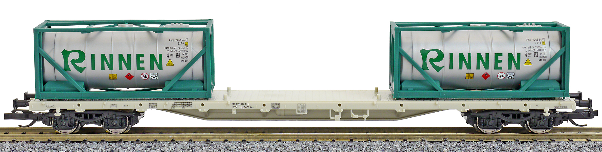 | nákladní plošinový vůz šedý se dvěma cisternovými kontejnery „RINNEN“ |