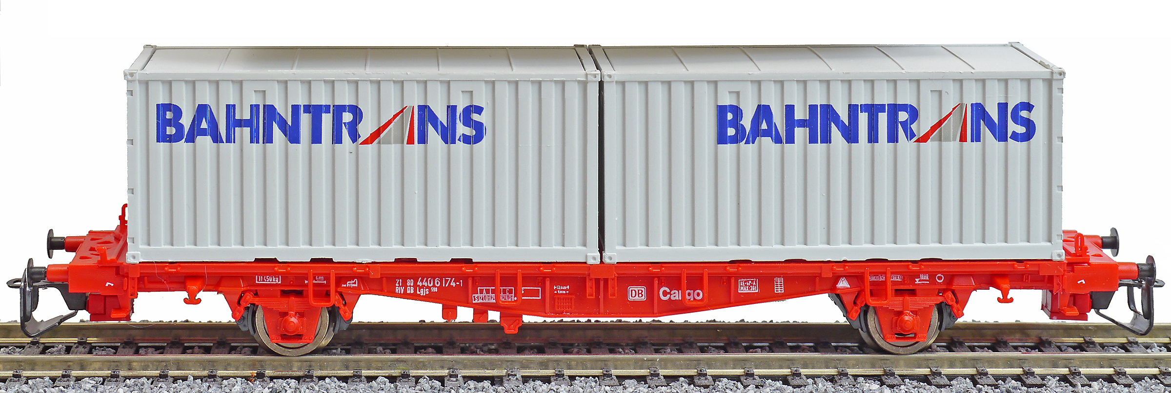 | plošinový nákladní vůz červený se dvěma kontejnery 20' „Bahntrans“ |