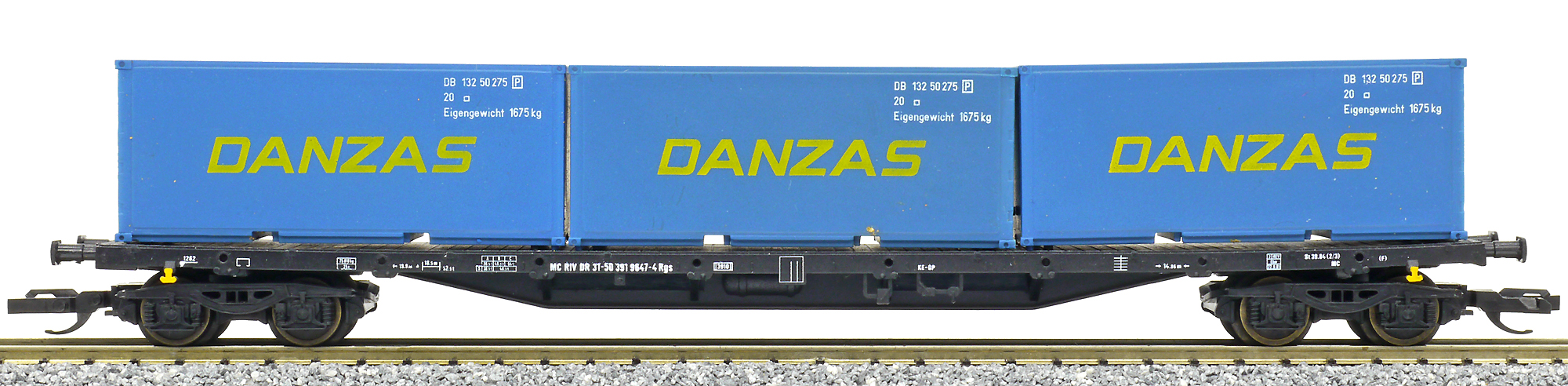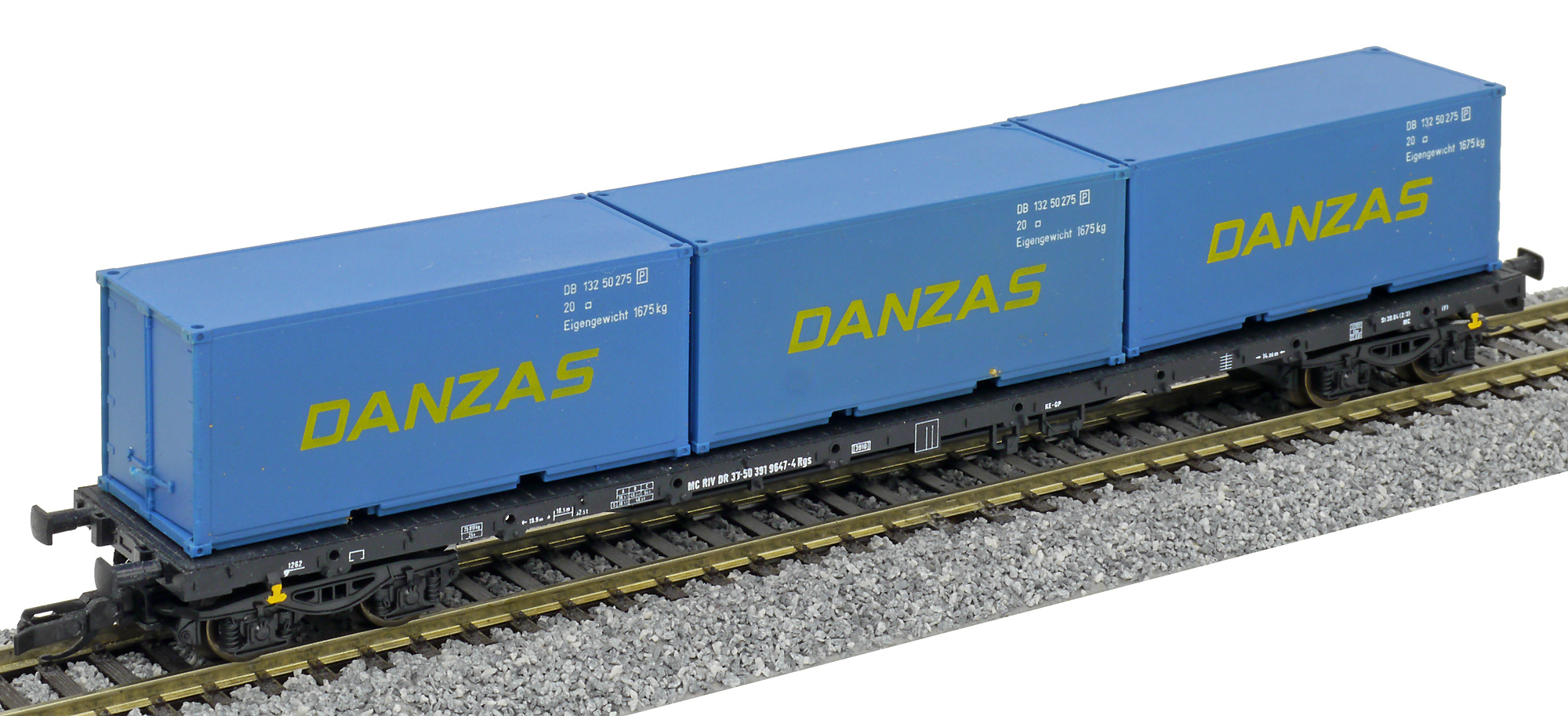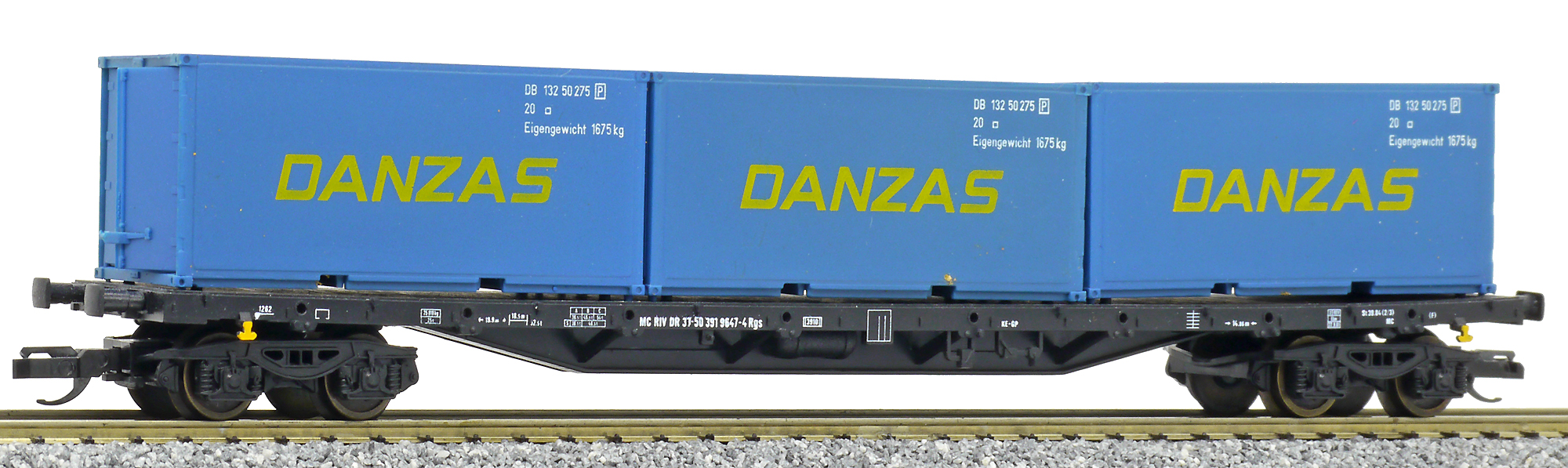 | nákladní plošinový vůz černý se třemi kontejnery 20' „DANZAS“ |