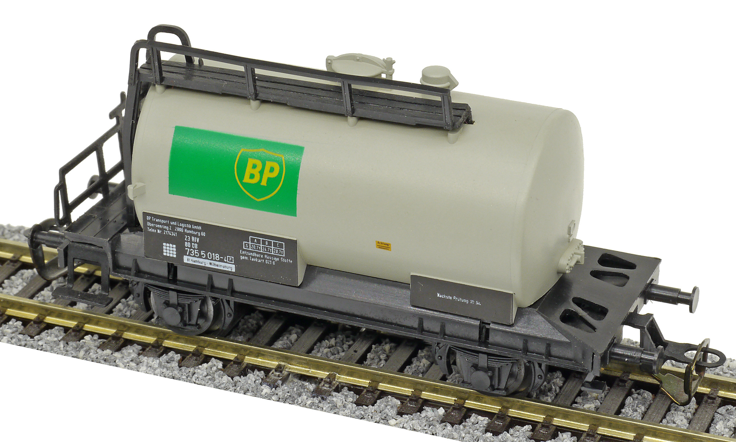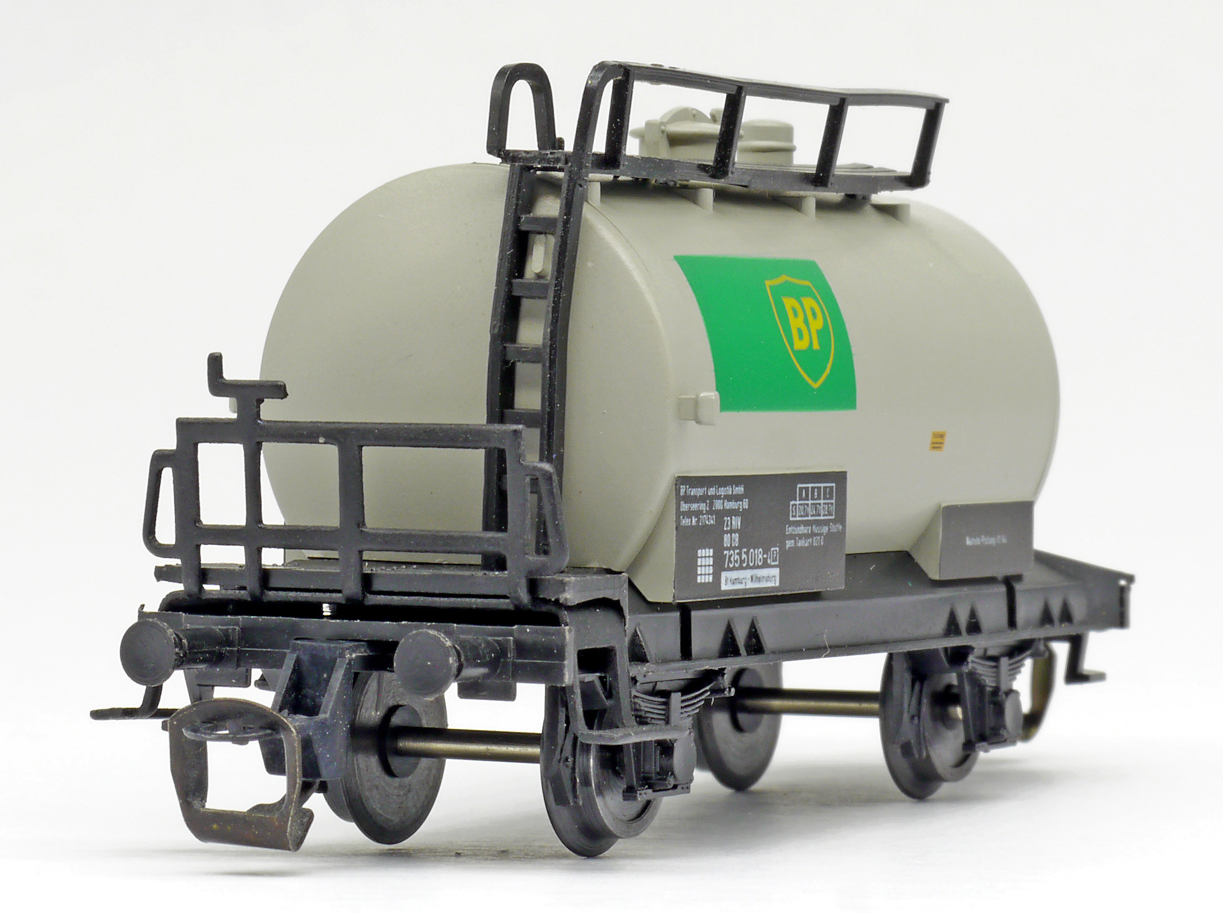 cisternový vůz světle šedý s černým rámem „BP“