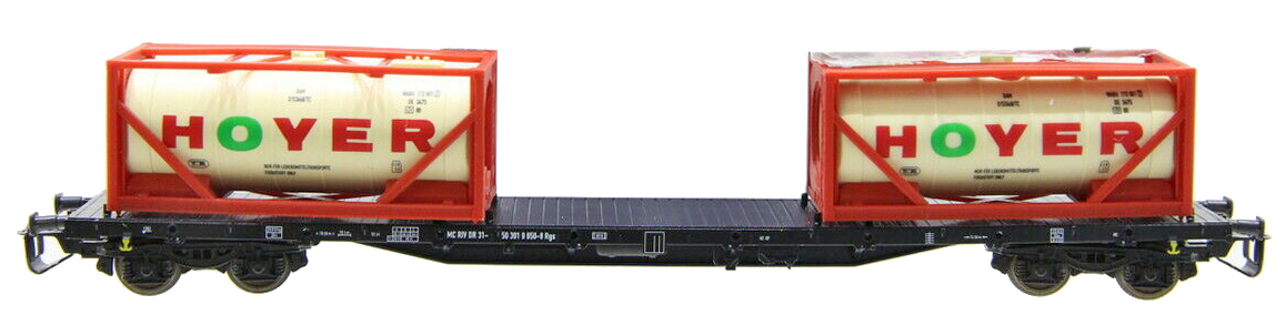| nákladní plošinový vůz černý se dvěma cisternovými kontejnery 20' „HOYER“ |